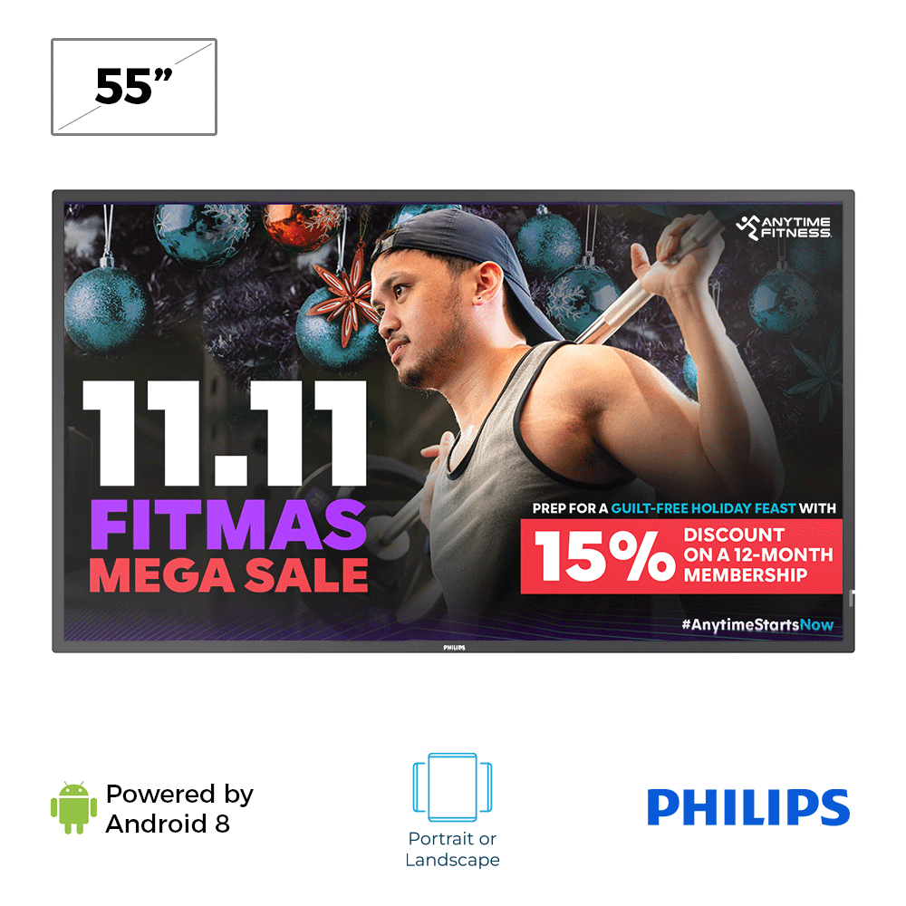 - 55 inch digital signage display offers a brilliant 55” 4K Ultra HD screen with 3840 x 2160 resolution for vivid, detailed visuals