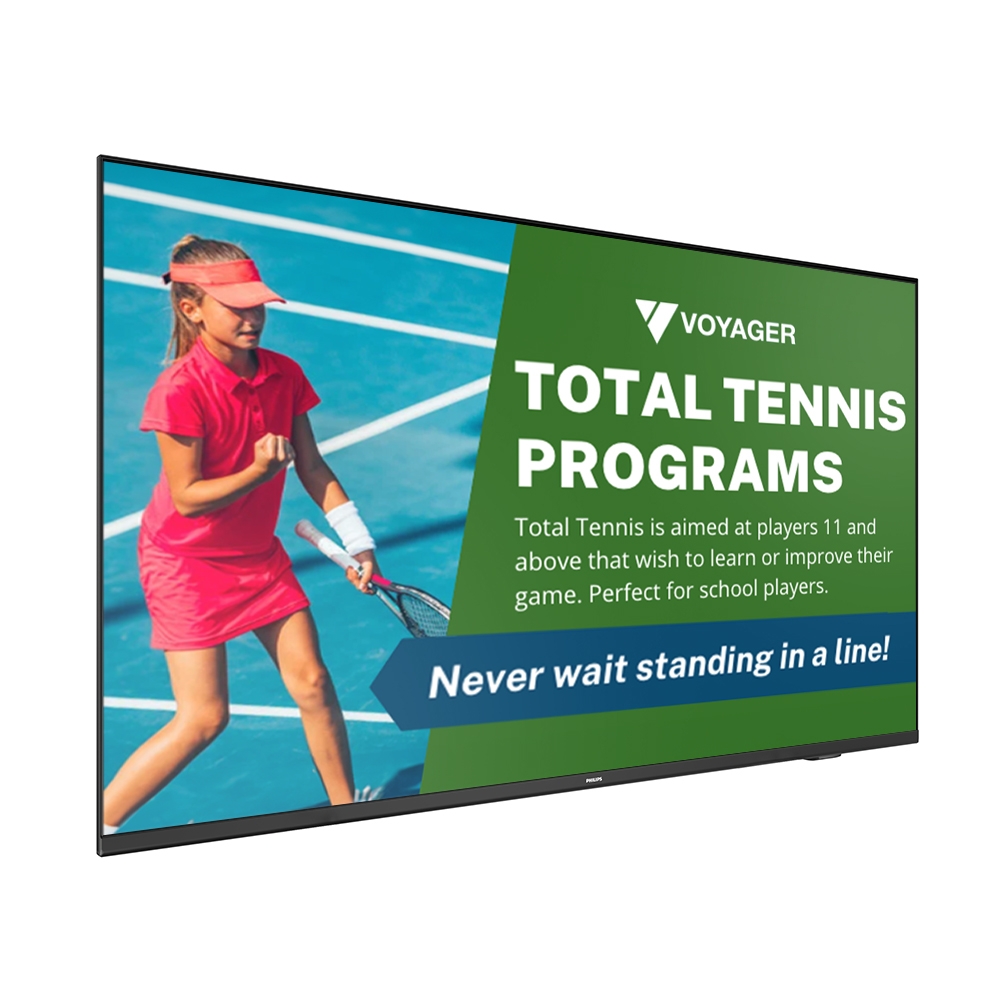 The digital flat panel monitor, LCD display signage offers multiple options for managing content across single or networked devices. AppControl allows businesses to update and organise apps individually or at scale, while the built-in scheduler automates when promotions or messages are displayed. Philips CMND & Control simplifies remote adjustments to settings and software via LAN or RF connections. Another option is a 3-year license with Fusion Signage, a cloud-based platform with offline support that enables edits to be made from anywhere and pushed directly to screens. Featuring advanced scheduling, playlist management, screen grouping, and widgets like QR codes, time, weather, and news, Fusion Signage ensures engaging, professional content is easily managed. The user-friendly designer and marketplace provide free, customisable templates to suit your business needs, making it an effortless solution for creating dynamic digital displays. This eco-friendly signage option reduces paper waste by replacing printed advertisements with reusable, digitally updated content.