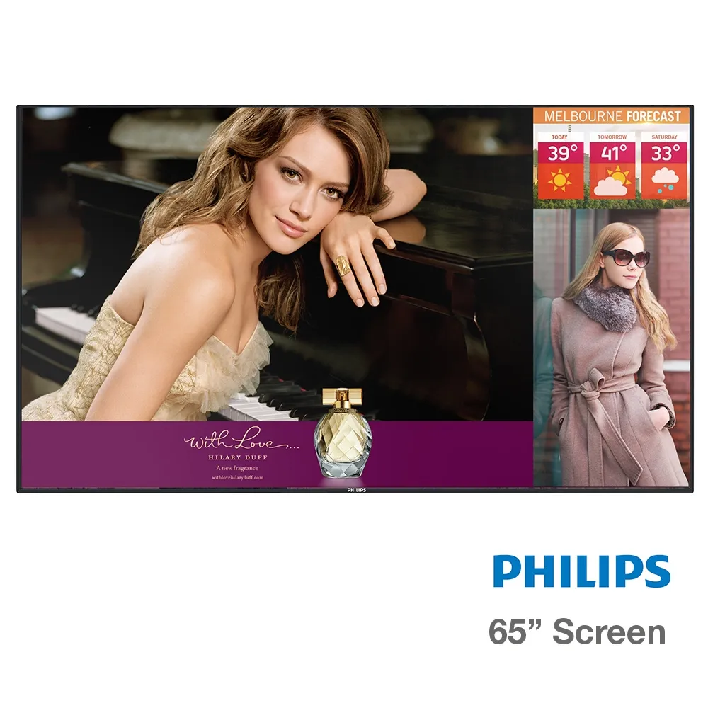Philips commercial displays feature a huge 65" flat panel monitor that offers 1920 x 1080 full HD resolution to really draw in the attention of passersby! This monitor is commercial grade, made of heavy duty components to allow 27/7 use and placement in portrait or landscape orientation, unlike most standard residential televisions. The back of the screen has 400 x 400mm VESA hole pattern for compatibility with nearly all mounting brackets, and the 3-year standard warranty ensures piece of mind with your purchase.