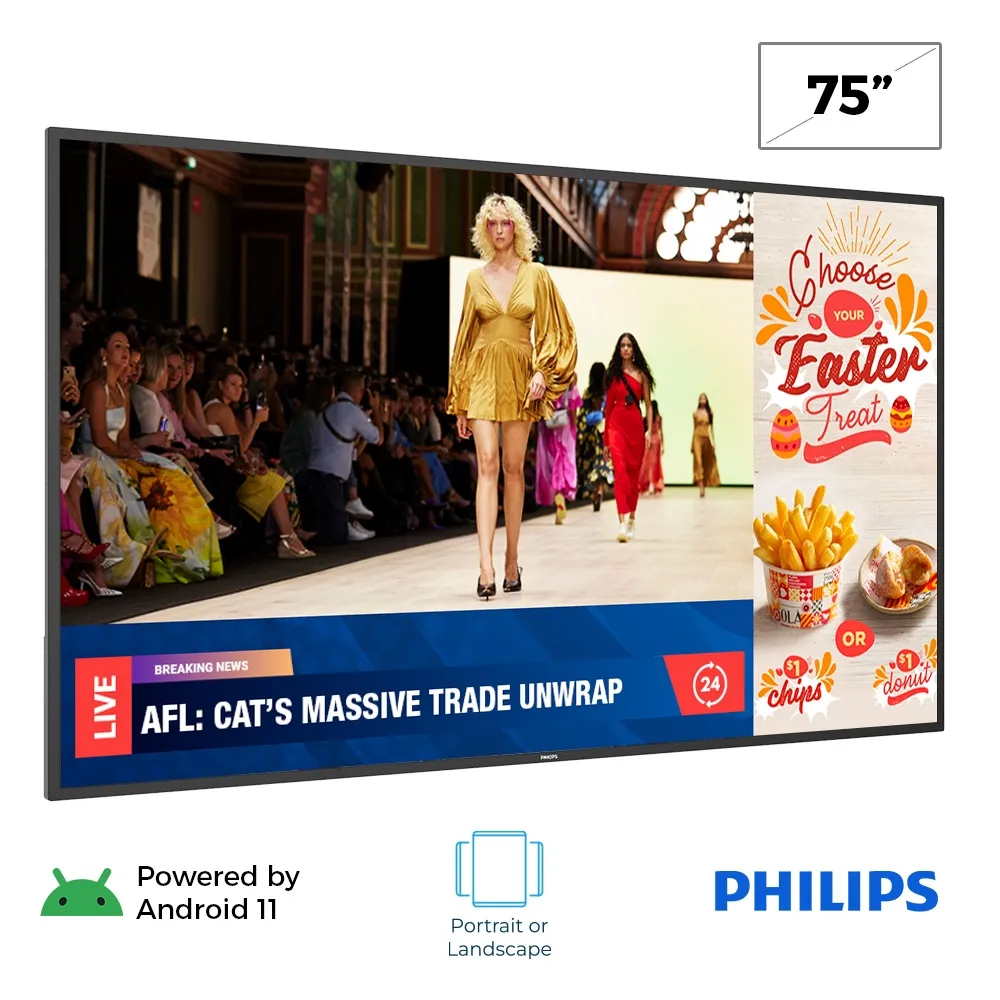 This digital advertising board helps businesses create compelling presentations to captivate customers and enhance their marketing efforts. The 75” flat screen HD panel features a 3840 x 2160 resolution and a 180-degree viewing angle, ensuring content is clear and vibrant from almost any direction. Running on Android® 11 with integrated Wi-Fi, the display makes it easy to connect to your network and utilise Android-based applications for seamless operation. With 32GB of internal memory, content playback remains uninterrupted, even during network disruptions, thanks to cache storage. Philips FailOver technology automatically transitions to backup inputs, ensuring your screen always displays something.