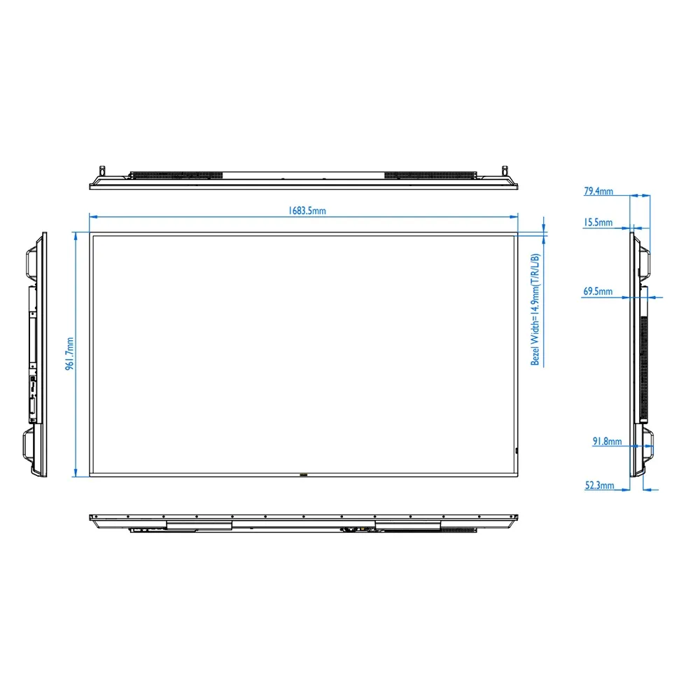 - LCD commercial display features a vibrant 75” 4K Ultra HD screen with 3840 x 2160 resolution and a 180° viewing angle for engaging, high-quality visuals