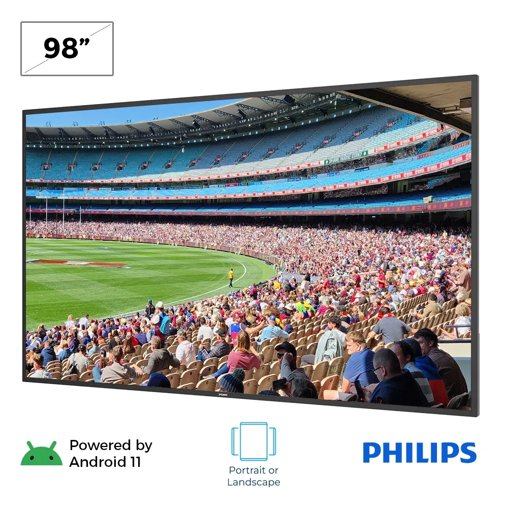 This digital screen for wall is an excellent choice for businesses seeking to create large-scale, eye-catching presentations. The large 98” flat panel features a 3840 x 2160 resolution, delivering sharp visuals with vibrant colours that will draw in passersby. Its 180° viewing angle ensures your content is easily visible from nearly any position in a room, making it ideal for wide, open spaces. Running on Android® 11 with integrated Wi-Fi, the display supports Android-based applications for streamlined content creation and management. 32GB of internal memory helps provide continuous playback even during network interruptions by caching content locally. Philips FailOver technology further enhances dependability by automatically switching to backup inputs, ensuring your screen always displays content and visitors are never left with a blank monitor.