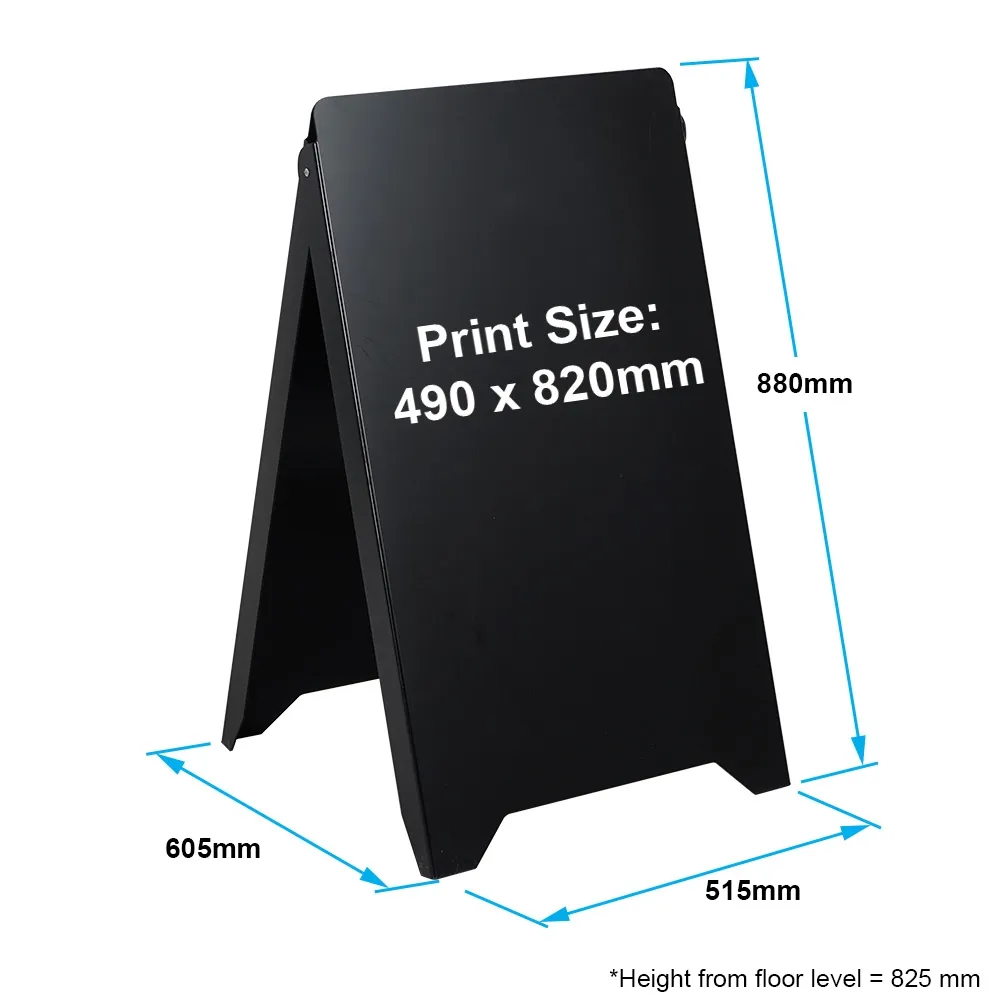 These plastic A frame signs make it easy to advertise or inform outside of your shop, cafe, restaurant, milk bar, and even arenas and carparks. The pavement signage has a dual-sided design that offers visibility in multiple directions at once from a single footprint to maximise space in all locations. The A board is 515 x 825 x 605mm when set-up, a large size that is easy to see and offers heaps of space for your poster boards to have eye-catching designs and graphics. The graphics stand above the top of the display when installed to make the height 840mm from the ground!