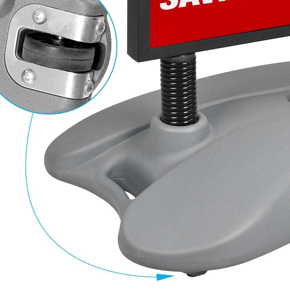 The sidewalk signage holder is perfect for sign shops to purchase to sell with their own printed graphics. This display features wheels on the base to easily be moved into position by any employee, as well as bringing the unit inside at the end of the business day. Switching out graphics is easy as well, with no tools needed to slide graphics into channels on stand!