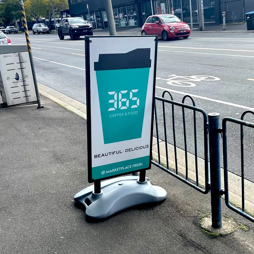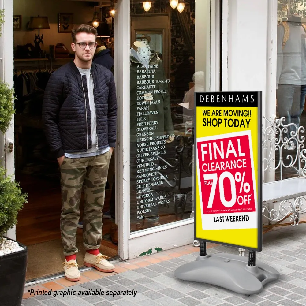 The footpath signs, like a pavement display & A-frame sandwich board, is able to hold a large 600 x 1200mm graphic within the centre channel. There are channels on each side of the display to allow you to use the stand as a a single or double-sided display. By utilising a double-sided stand, you reach out to more customers at once without having to take up additional space the pavement to allow the public to walk freely!