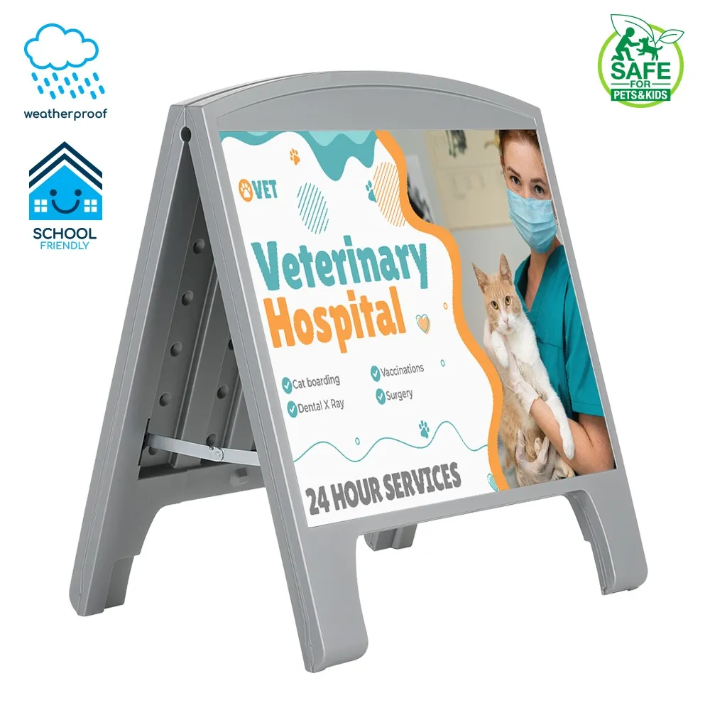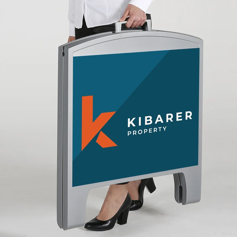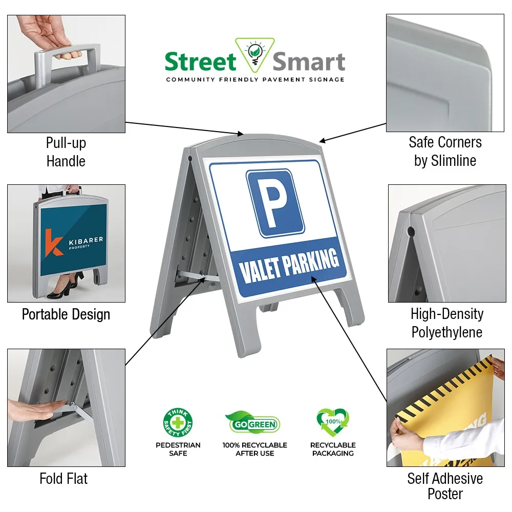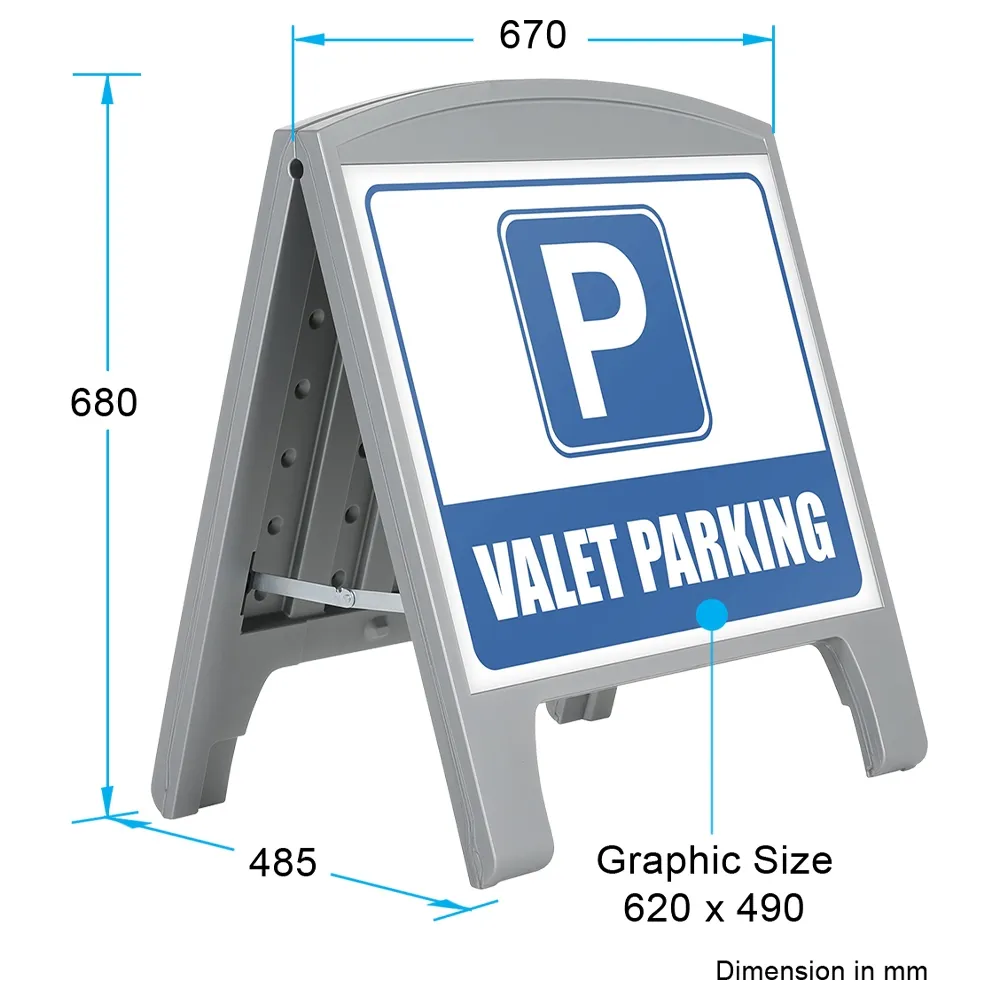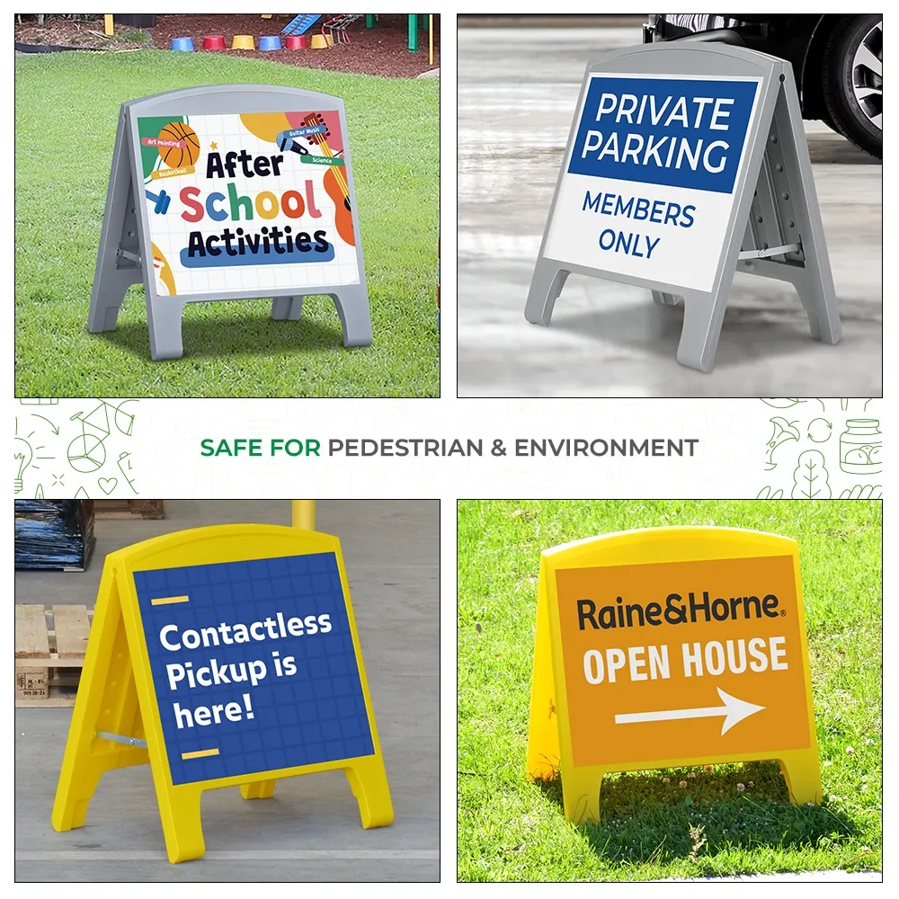 Small pavement signs make advertising easy and can be placed outside of restaurants, cafes and festival tents for promotions or offer valuable information at construction sites, transportation hubs, and information centres. The outdoor A frame sign features an all-weather design that holds up well to daily use in all environments! The sandwich board includes (2) 620 x 490mm signs, one for each side of the display. 2-sided A frame maximises exposure to passersby from single footprint. Your custom designs are digitally printed in full colour to create an effective marketing display that can be seen in multiple directions at once.