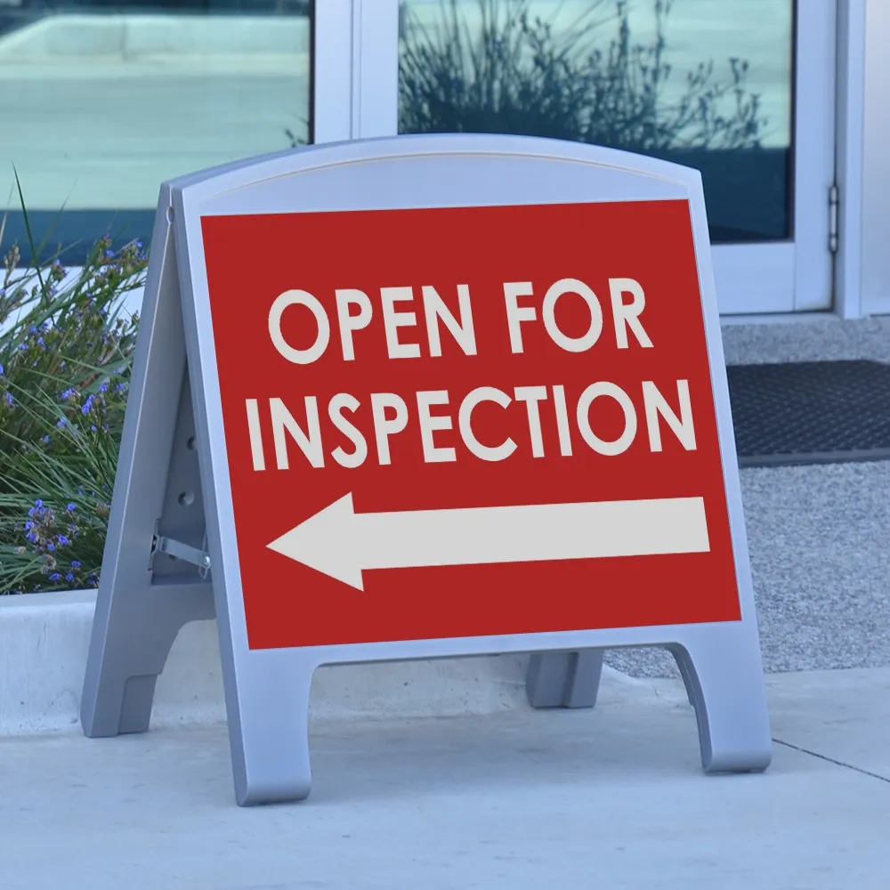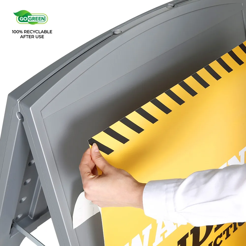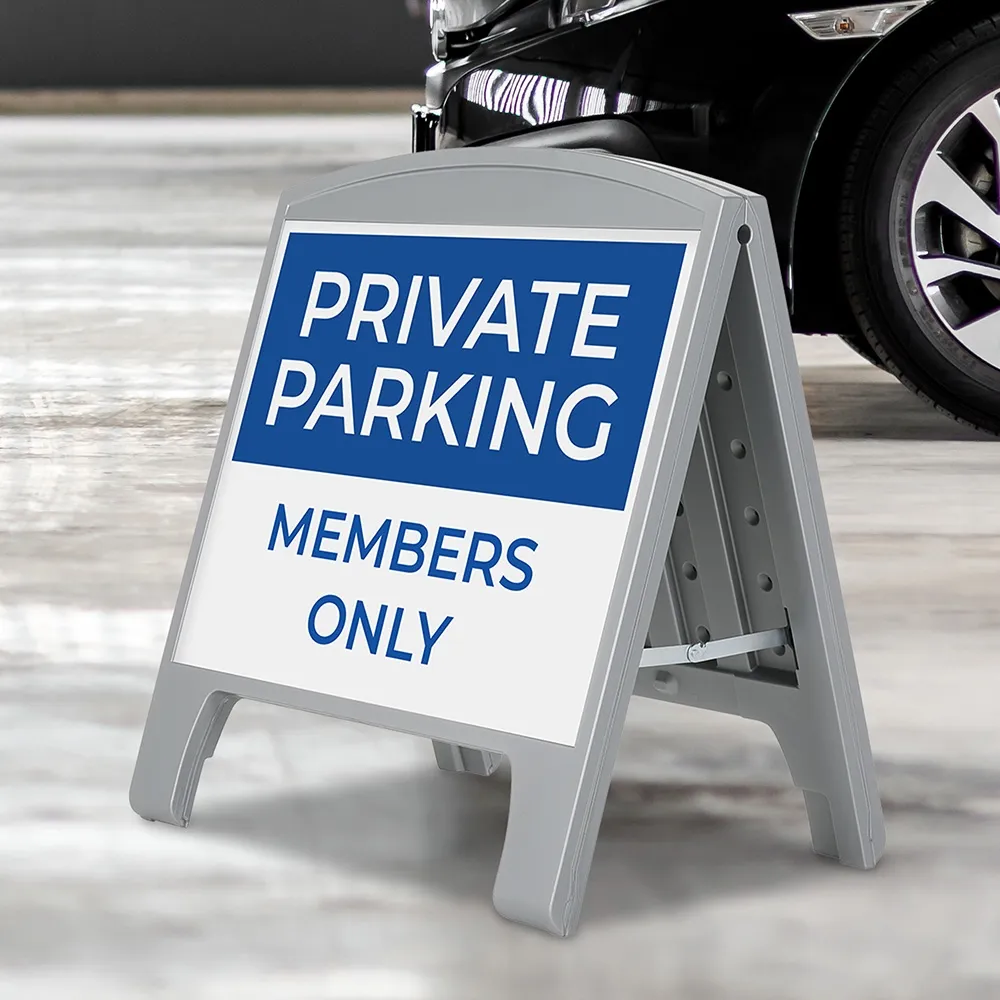 The small pavement signs, like many A board frames, have a portable design to make positioning the lightweight display where desired easy. The folding sandwich board can also be stored in a small are in between uses. There are pop out handles on the display that offer easy carrying whilst being hidden while the A frame sign is upright. Strong metal hinges on each side ensure the pavement sign stays open whilst in use and are easily raised to collapse the signage for transport and storage.