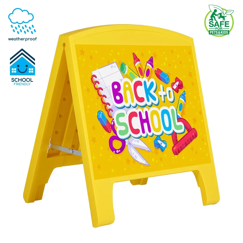 Small sandwich board frame sign display a 620 x 490mm custom graphics on each side to be easily seen in multiple directions at the same time to maximise exposure to passersby! The outdoor sandwich boards are popularly used at restaurants, open houses, cafes, retail stores, car parks, information centres, and more. Custom designs are digitally printed by our in-house team of experts, offering vivid colours and bright imagery that will surely draw attention of passersby. Our in-house team is available as well to help, with three tiers of assistance from our graphic design team available to suit differing needs.