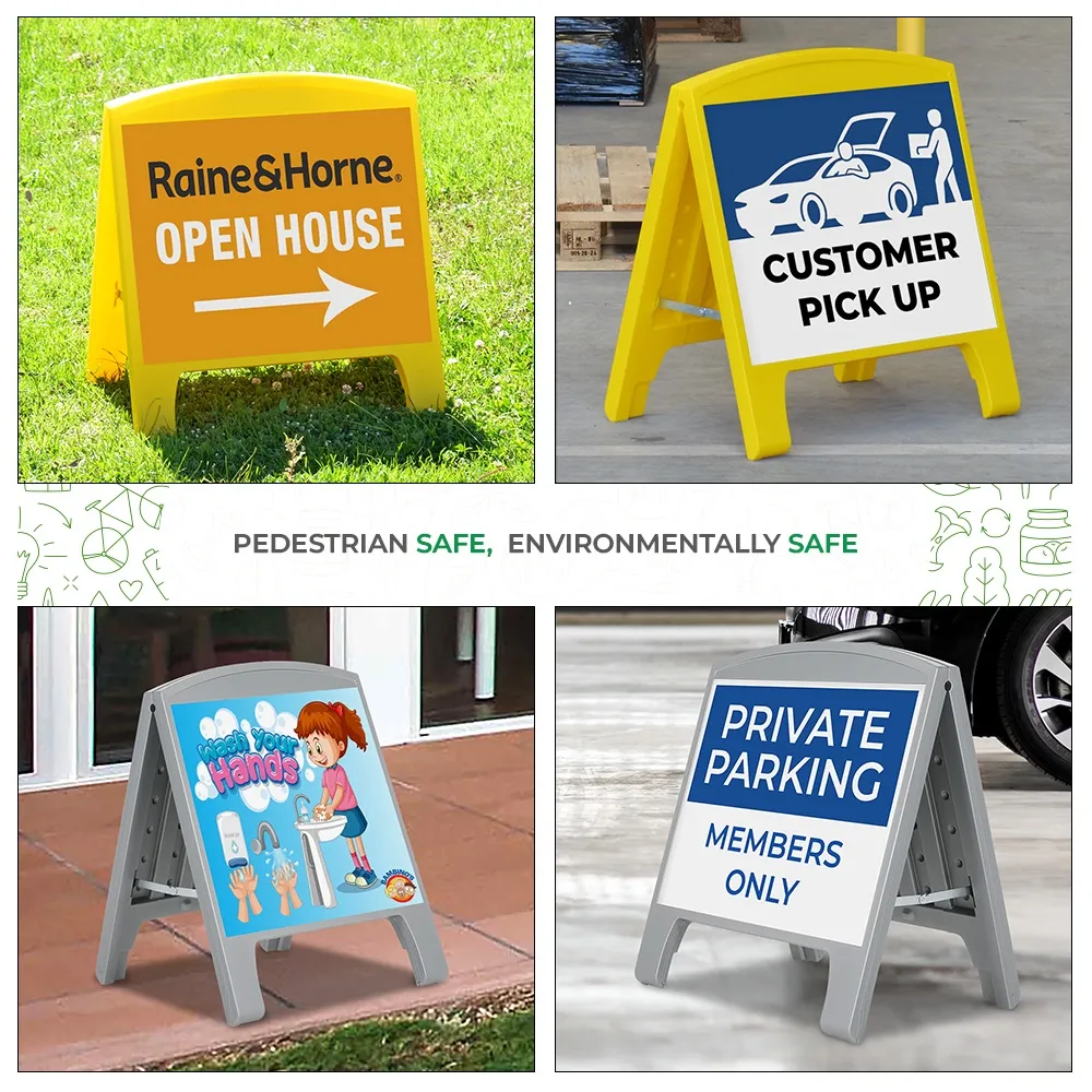 These A board frames,, small small sandwich board signs use a portable design that is easy to be brought into desired areas and stored when not in use. When open, the pavement signage is 670 x 680 x 485mm, but collapses down to only 8mm thick! The top of the unit has a built-in handle for easy carrying that is hidden within the top. Each side has a metal hinge that ensures the sides are kept open and can be snapped up to collapse the sign.