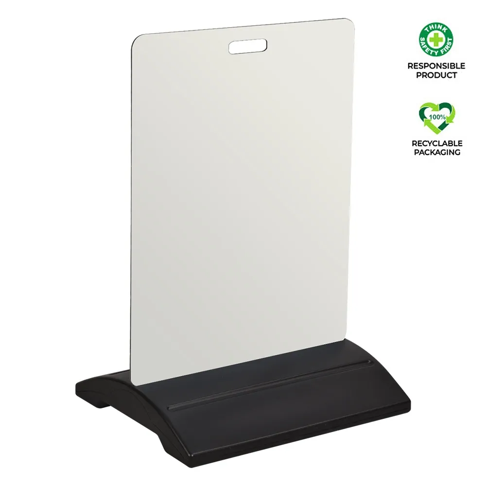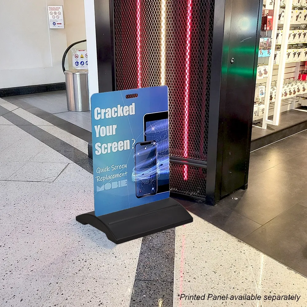 This outdoor display, outside sign board uses a ABS black plastic base to hold your signage in place, a durable stand that can be used daily outdoors. There is a screw-in plug on the bottom that holds up to 15L of water or sand to add substantial weight to the base for stability. The plug features a rubber gasket as well to prevent leakage whilst the base is filled and in use. When not filled, the base is only 3kg, making it easy to both move around and store when not in use.
