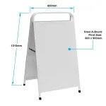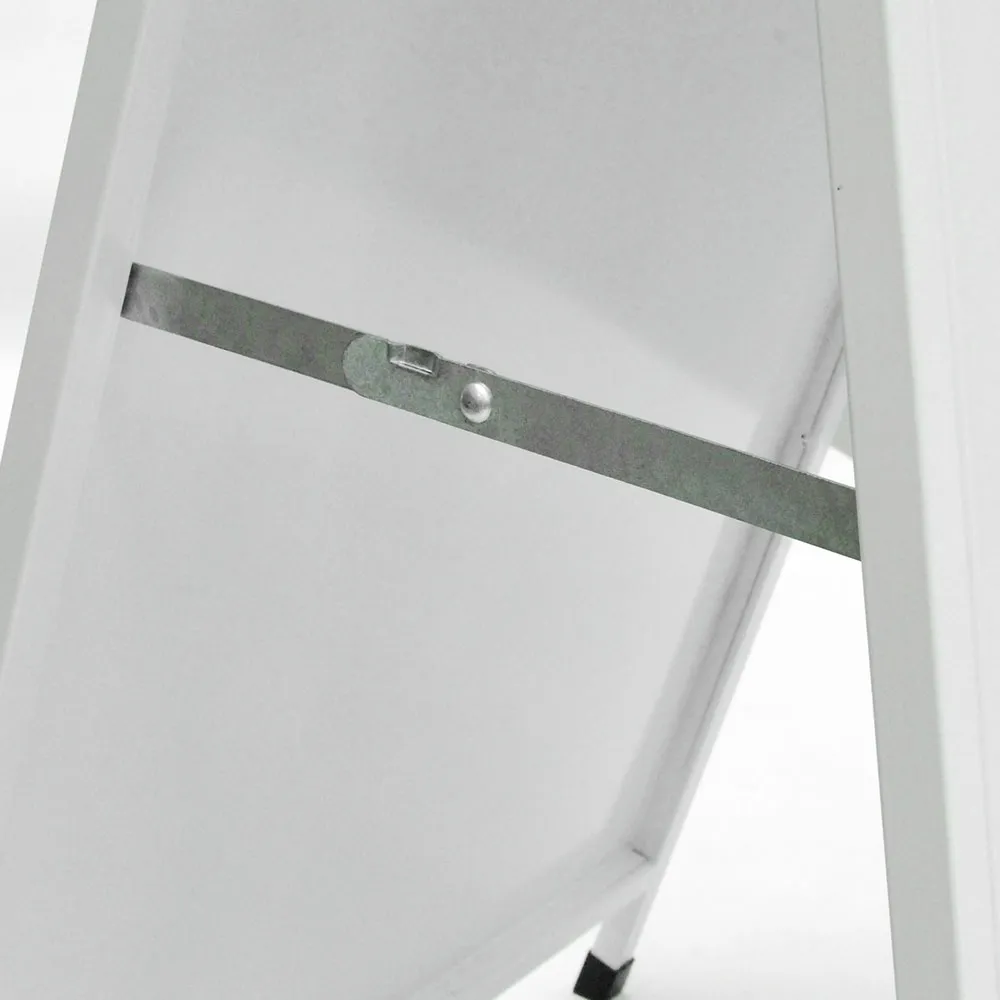 This metal sandwich board sign has a tough welded construction that has been powder-coated white and includes waterproof vinyl prints applied to both faces of the sidewalk sign, making it suitable for use outdoors in any weather condition. But they’re not just an outdoor sign they’re also great as an indoor advertising board.
