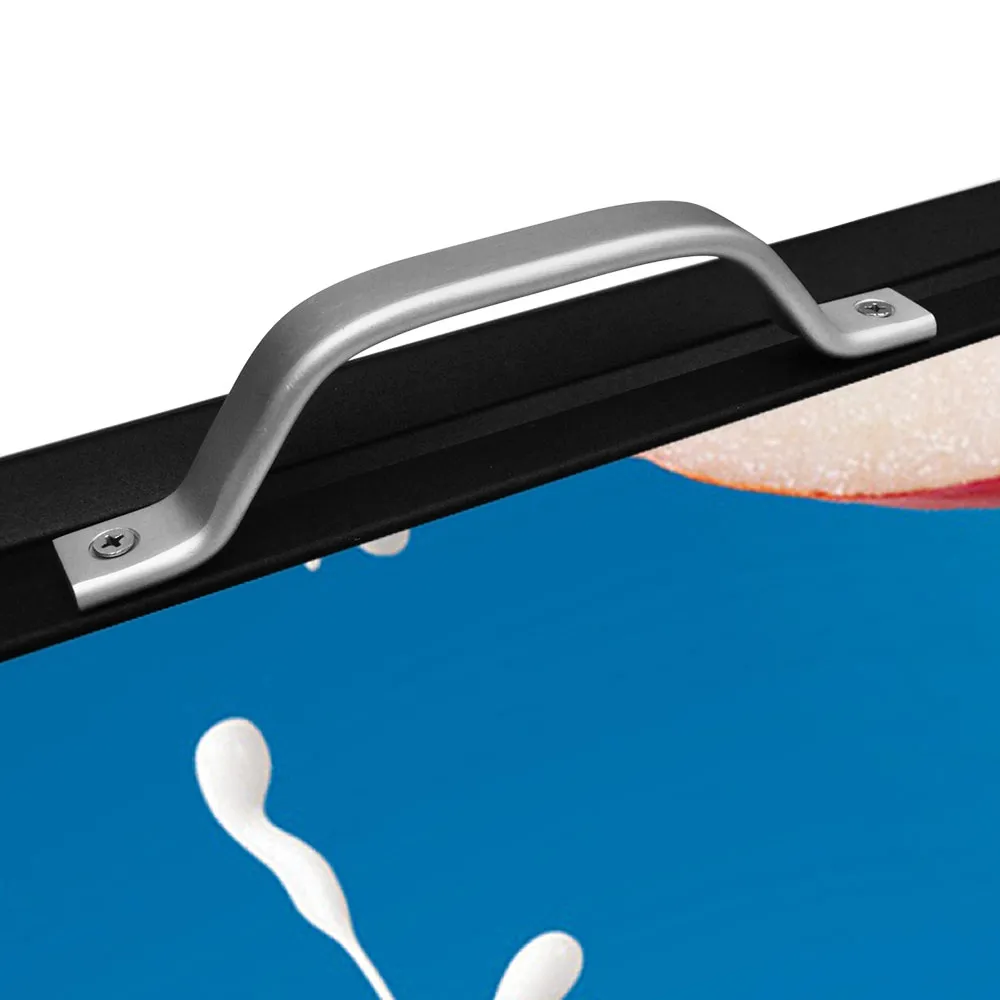 An A frame, also known as a blank outdoor sign and a pavement display, is made out of steel with a black finish, providing a durable display that be used for years to come in any environment. The blank outdoor sign is weatherproof, allowing it to be used in different locations with ease. The A frames have an aluminium handle that makes carrying the unit a simple task.