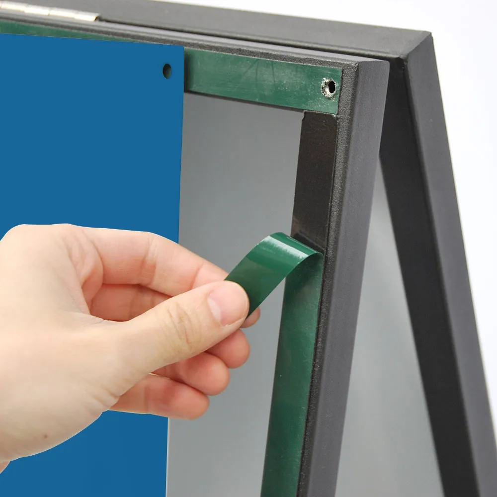 The sidewalk sign, A frame includes two metal boards that are 900 x 1200mm. These white boards can have graphics applied or printed on them from a local print shop, and the be reattached to the frames for a complete display. The A frame is perfect for sign shops to purchase and sell as a complementary product to their printing services. Rivets are included with the frame for attaching and detaching these boards, with extras supplied for use during changes.