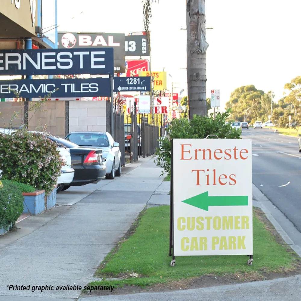 This A frame is designed with roadside use in mind, as the large boards can be seen by motorists to promote warehouse sales, discount outlets, live music, car parks, upcoming events, and even used by furniture wholesalers. The blank outdoor sign is an easy way to promote in an eye-catching manner.