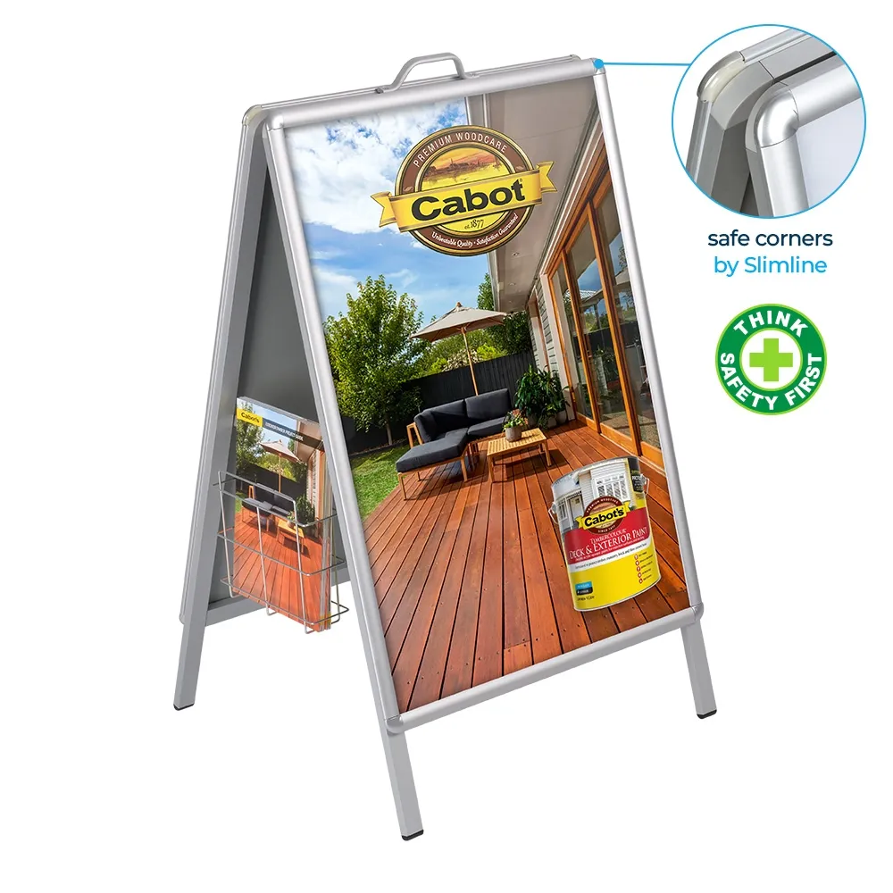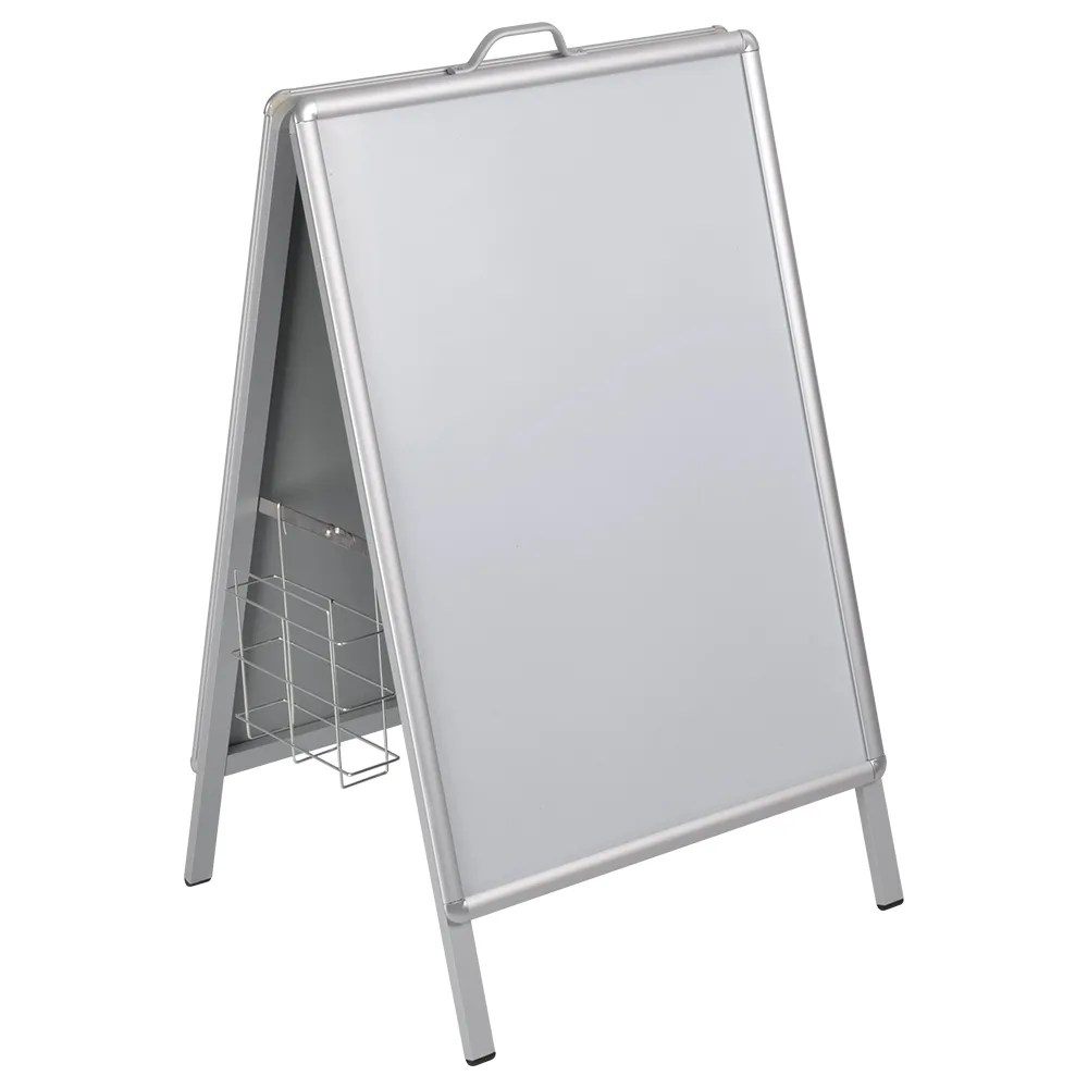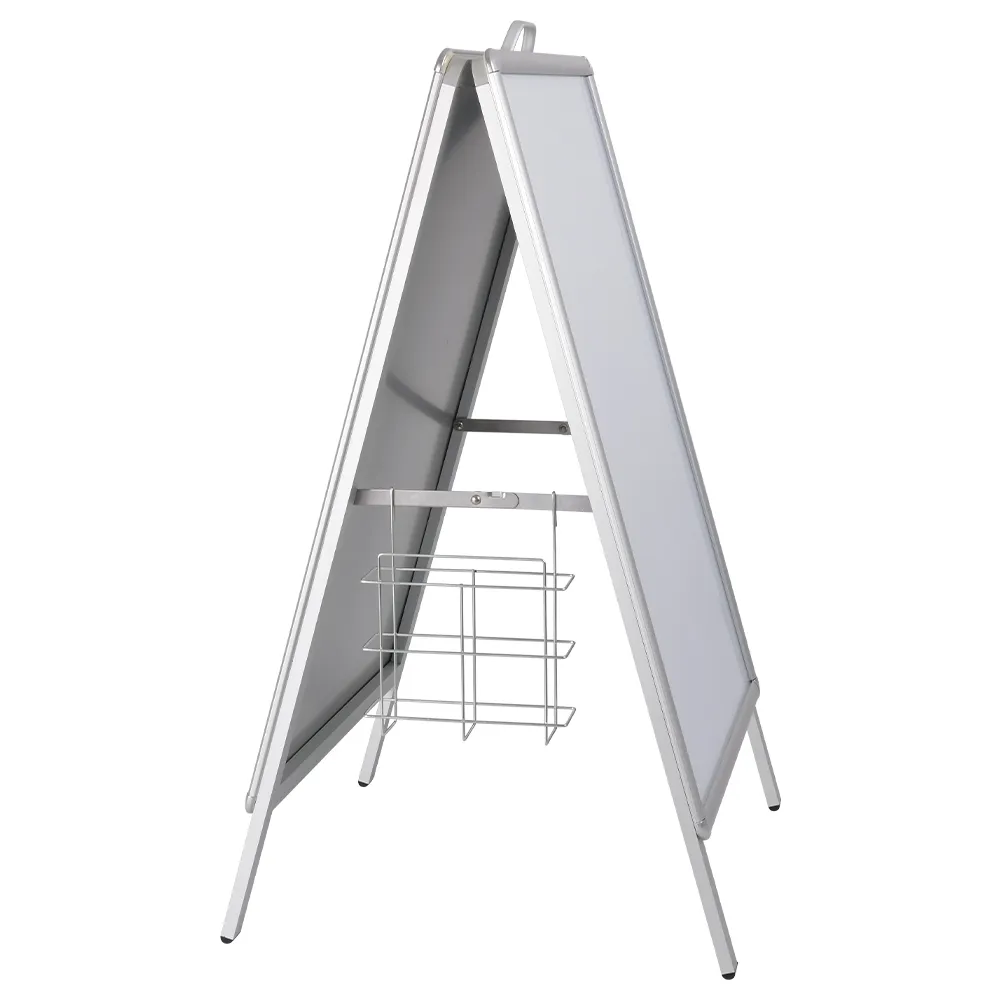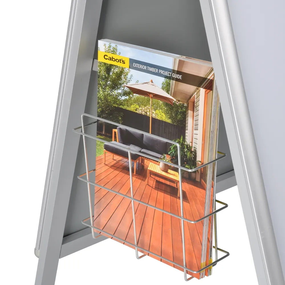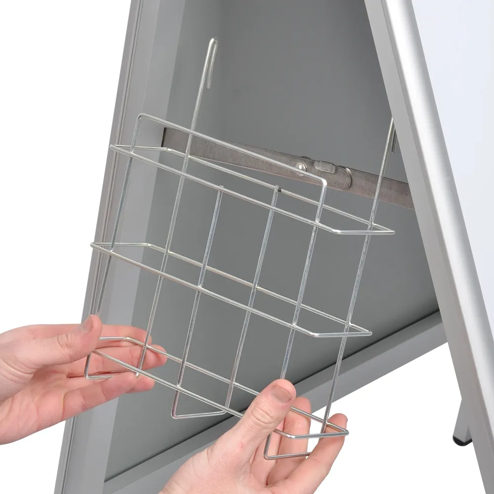 The sandwich board, A frame poster holder is a multi-faceted display, with a brochure pocket included that attaches to the stand to provide take away information for passersby. This wire basket hangs off the side hinge on either side via slim hooks, easily sliding into place and being securely held by gravity to keep them from falling off. The basket is 70mm deep, able to hold up to 500 brochures without protruding out to interfere with a footpath. Display a single A4 (210 x 297mm) or two DL (99 x 210mm) leaflets in the display to provide visitors or potential customers something to bring home to consider or learn about.