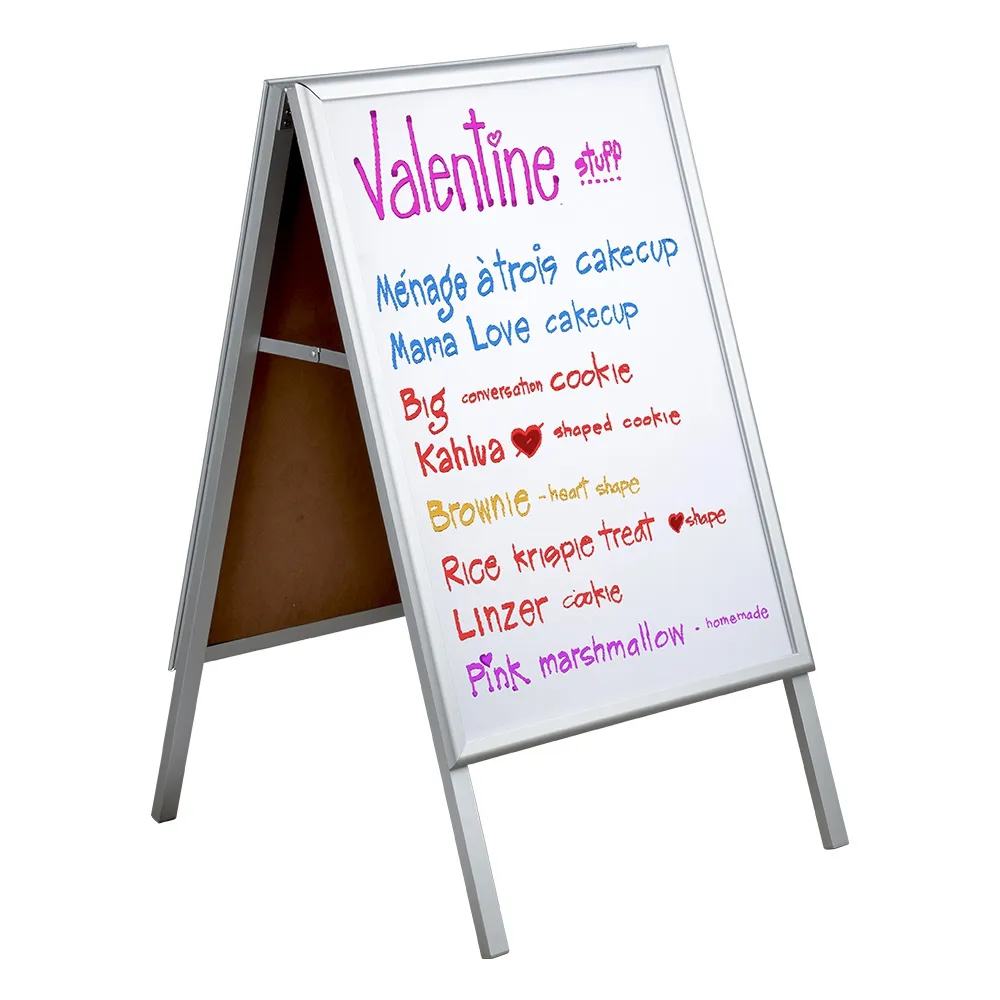 Sidewalk signs, A boards, and other pavements displays also have a marker board surface that allows messages to be written with wet erase markers. These messages can be changed quickly by wiping away with a damp or moist cloth, making them perfect for fast moving businesses like retail stores, restaurants, bars, cafes, pubs, and more.