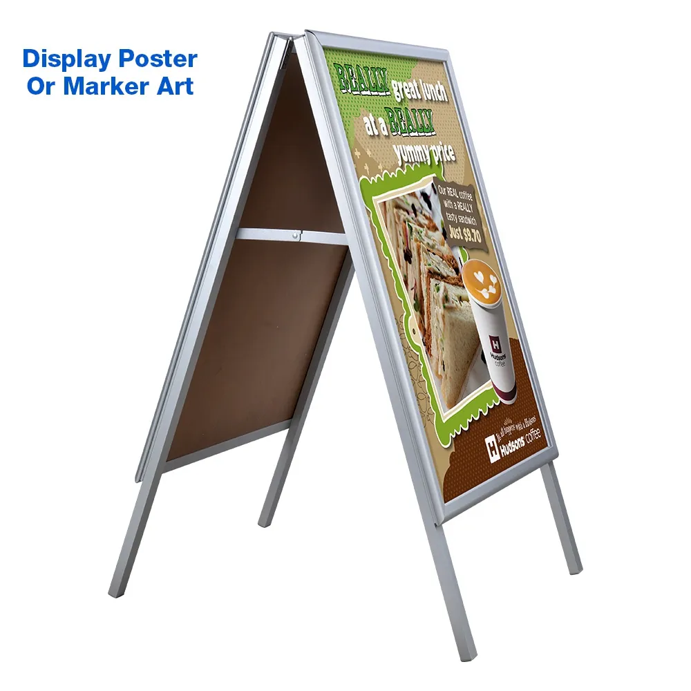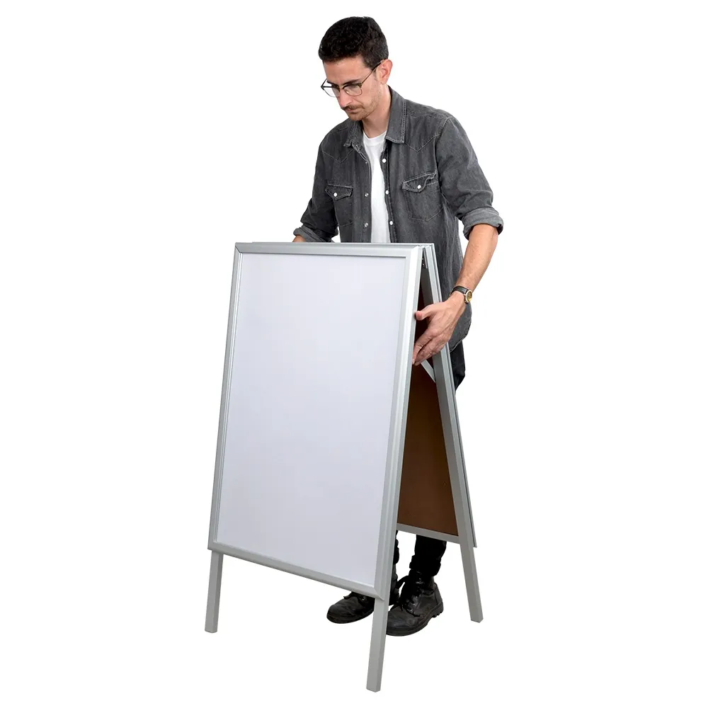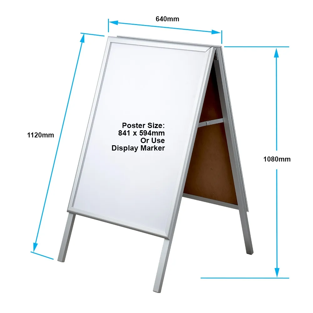 The A frame signs, pavement displays feature a dual- board that can be used to both display your A1 (841 x 594mm) sized graphics in portrait orientation, as well as written on with wet erase markers. The Aframe utilises a clip frame that makes switching out graphics fast and easy with no tools required, allowing employees to focus times in different areas.