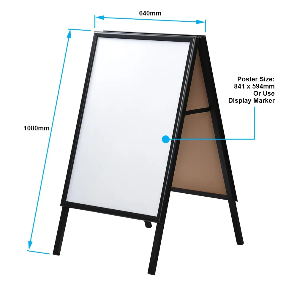 This sandwich board, pavement sign is able to display an A1 (841 x 594mm) custom graphic on each side of the stand. By utilising a dual-sided unit, you can reach more potential customers at the same time without taking up additional street or floor space! The sidewalk stand is perfect for helping to promote upcoming events, ongoing sales, or new products using eye-catching posters. A clip frame is used to hold the graphic in place, making switching posters extremely easy without any tools needed!