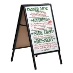 The sandwich signs, write on boards also utilise a marker board surface that can be written on with wet erase markers. These markers write in vivid bright colours, and allow for changes to be made quickly on the signs. To erase the board, simply use a damp cloth to wipe away the old message! Restaurants, pubs, and cafes often use these displays to write witty messages to help draw in traffic off the street, as well as promote menu items and upcoming bands!