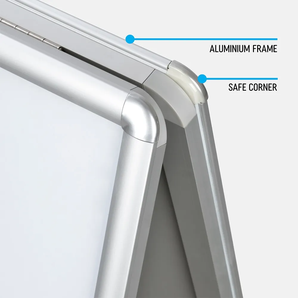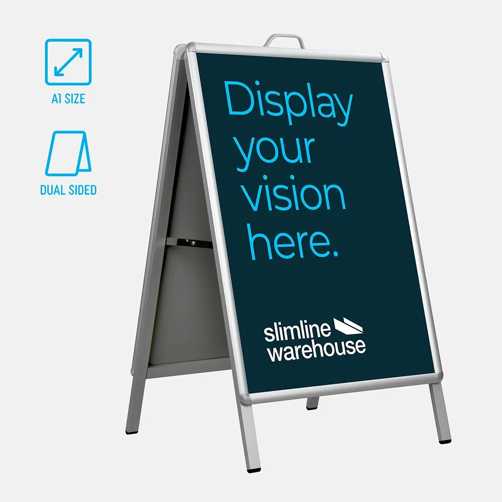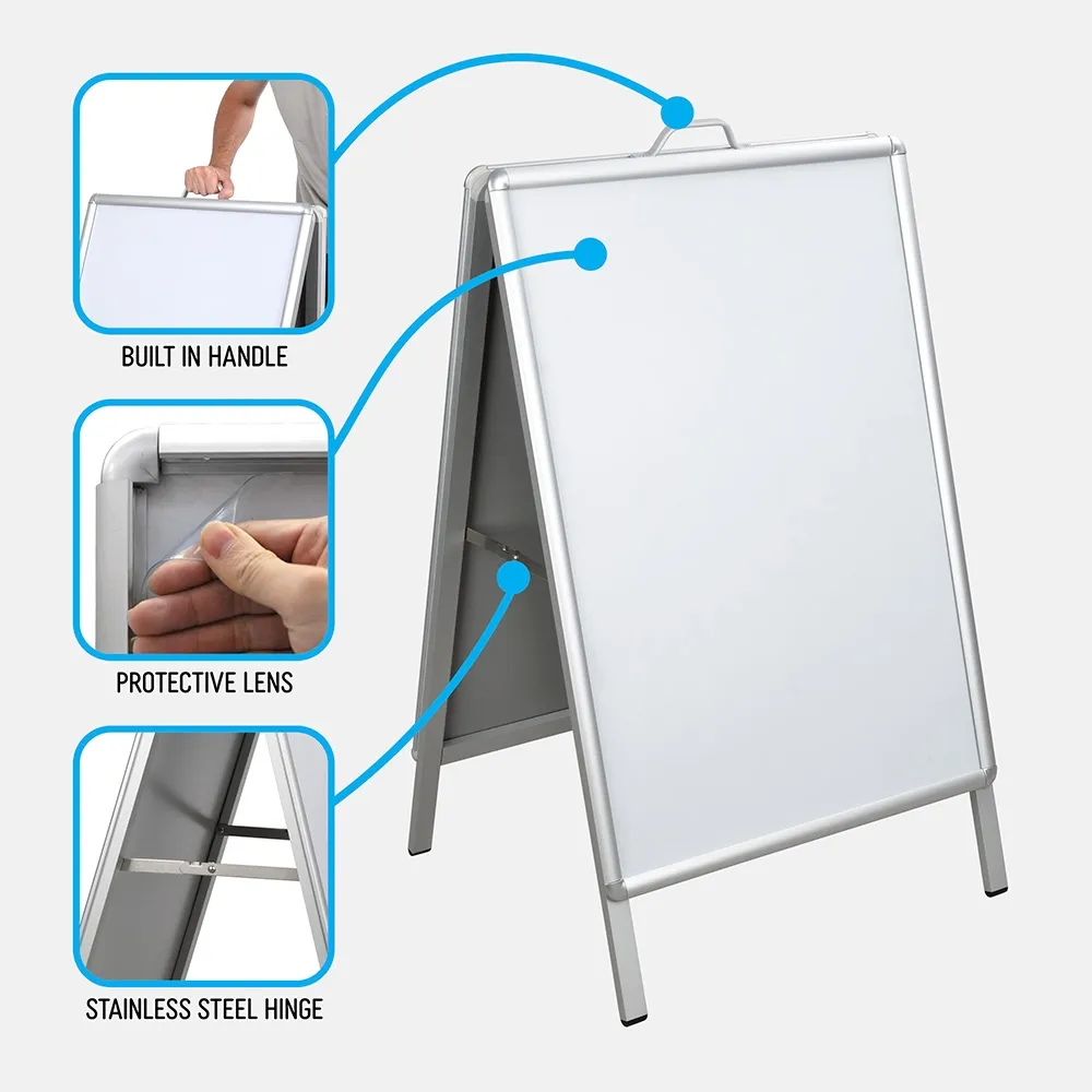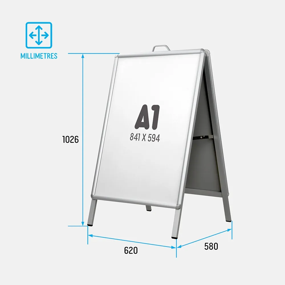 This aluminium A board, A frame hold an A1 (841 x 594mm) poster on each side of the display. A double-sided sidewalk sign lets you promote in multiple directions at once without taking up additional space! This A frame holds your custom graphics in style to get passersby attention. The magnetic frame allows you to post updated information on your posters without having to print new graphics!