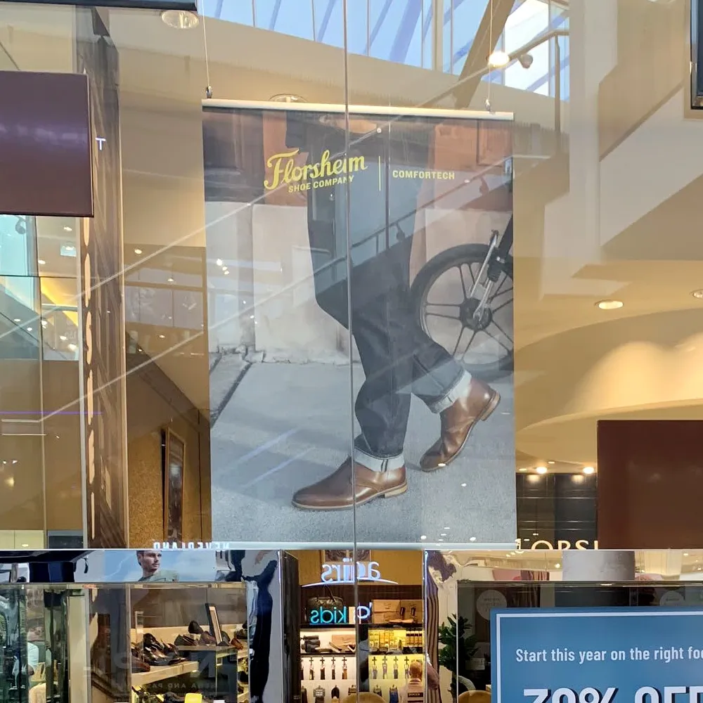 The banner gripper, hanging banner is a great marketing tool in a variety of locations. The large hanging poster rails can hold a graphic that is 700mm wide. This hanging banner can have any length, whether hanging in a store front, or all the way to the ground in the middle of a store! This hanging banner has a snap frame for holding your graphic in place. This allows for quick poster change-outs when necessary with no tools required. The hanging banner is found in chemists, retail stores, offices, and doctor offices.