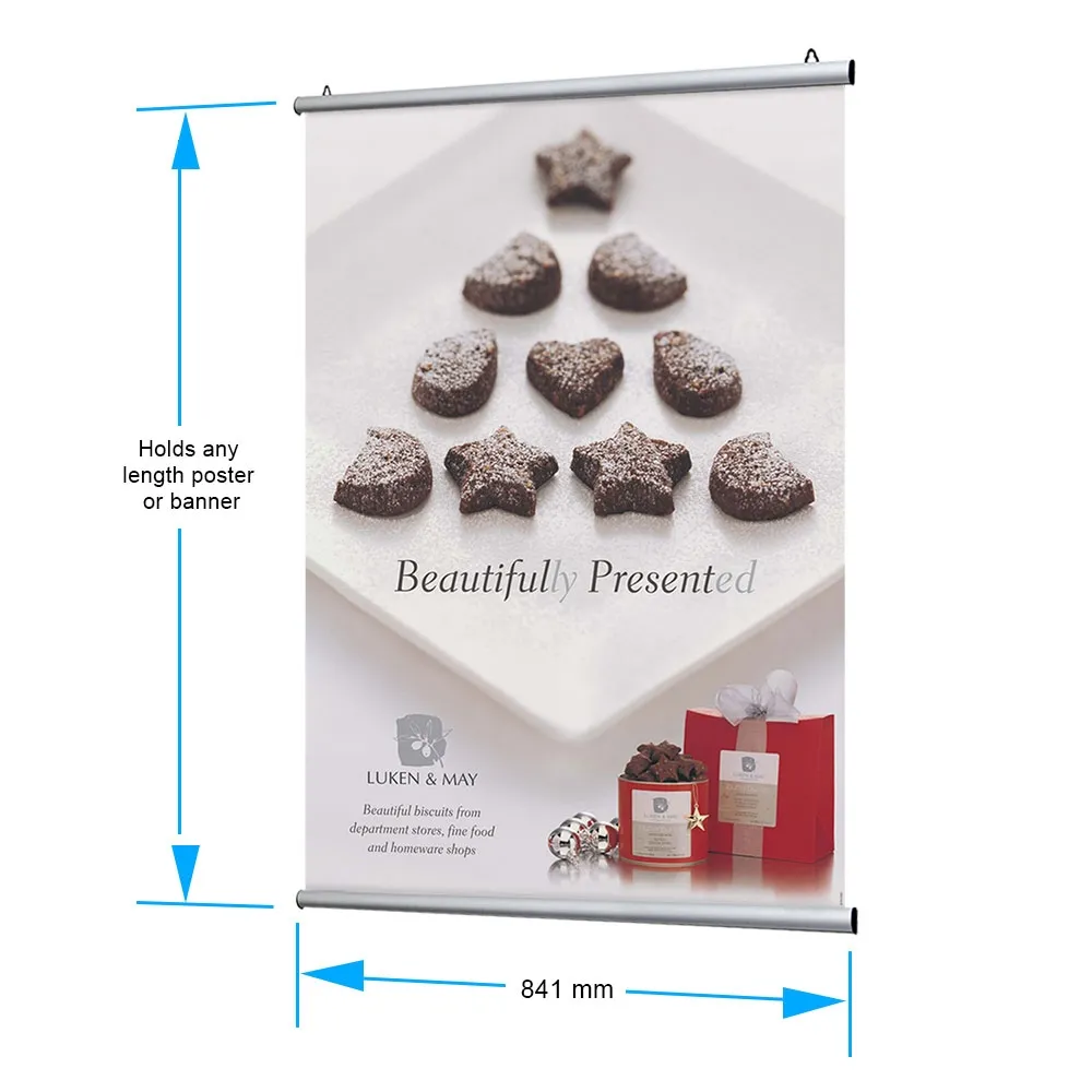A poster rail is used in a variety of different locations as a promotional tool. These poster grips have (2) rails included with each purchase. The top rail firmly holds your graphic in place, and the bottom rail keeps your graphic taut and readable to passersby. This poster rail, like a hanging banner, is found in retail stores, chemists, offices, information centres, and exhibitions centres. The poster rail is used to hold banners that are 841mm wide, but any length can be used. This is an especially useful tool for window displays of storefronts, where the large banners can take up the entire window to entice customers!