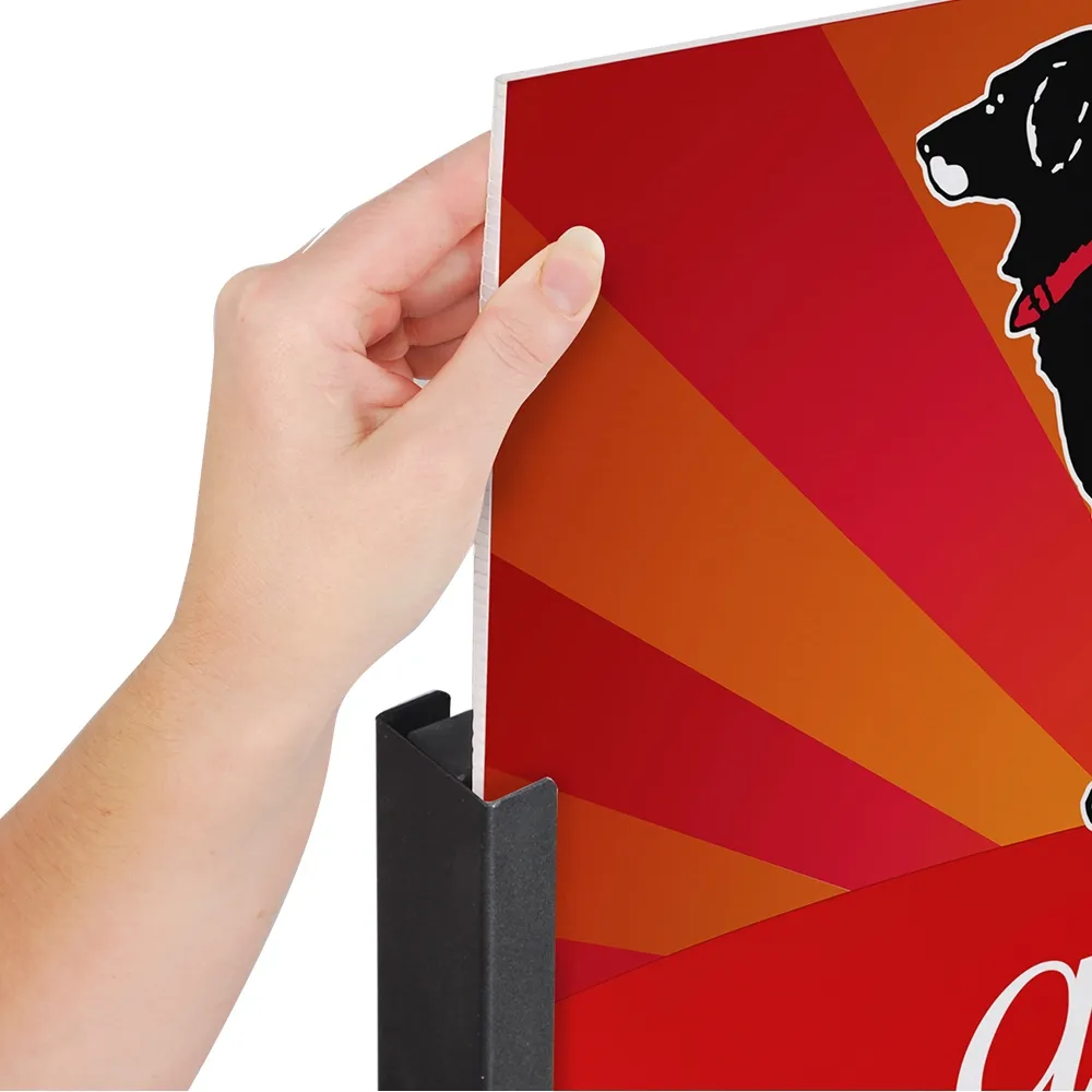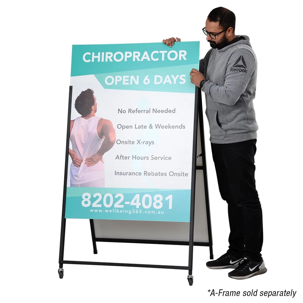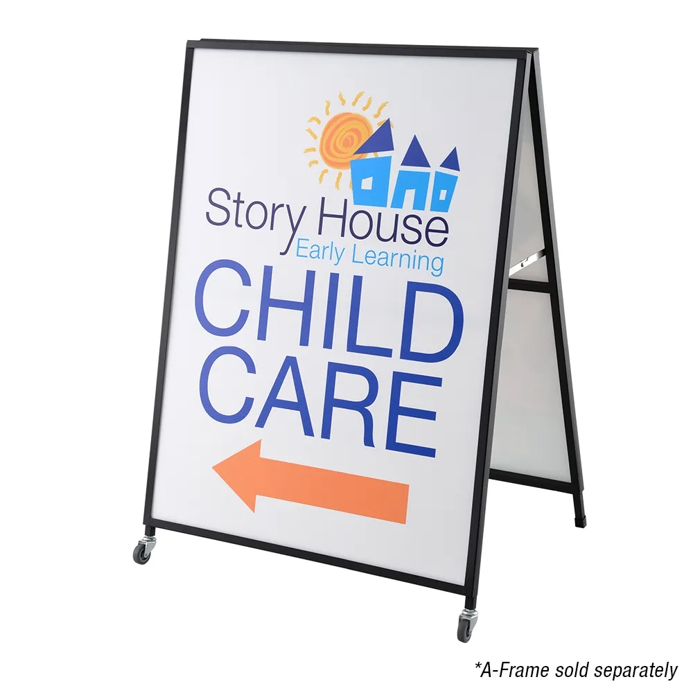 A frame corflute signs are printed by our in-house staff to work with your existing AB90120C and AB90120CFM pavement signage. The printing is done on a single side of the board, and a purchase of (2) is required when using with double-sided sandwich boards. Designs are digitally printed to ensure vivid colours and accurate depictions of your designs that will surely draw the attention of passersby. If you need design help, contact our staff of experts for assistance, with three different design packages to choose from to meet the needs of your business.
