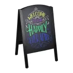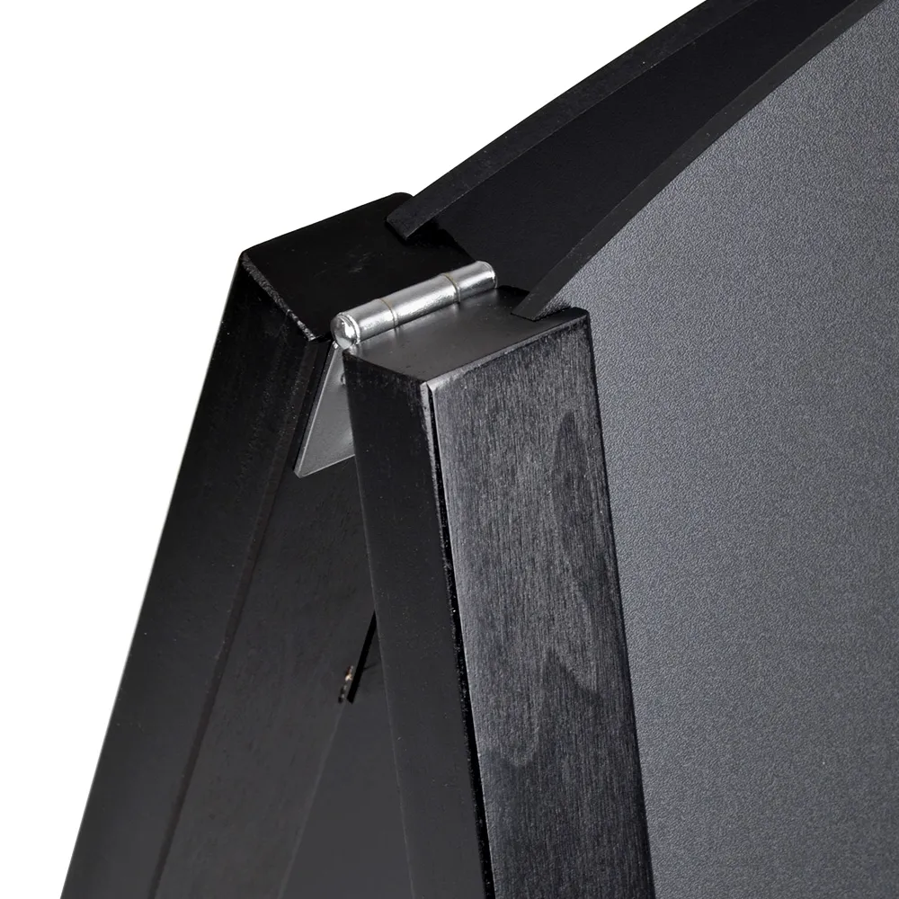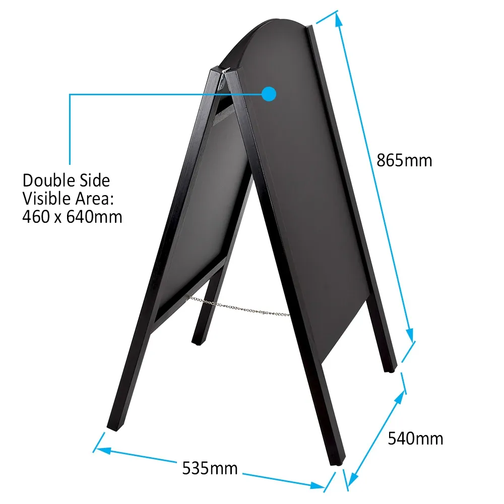 These A frame blackboards are made from timber with a black finish, providing a stylish look that fits in with the décor of any location. The sandwich board is lightweight to be easily portable as well, with the entire display folding small for easy transport as well as storage in between uses to conserve space. A 370mm chain attached to each side of the board ensures proper set-up every time for a sturdy display.