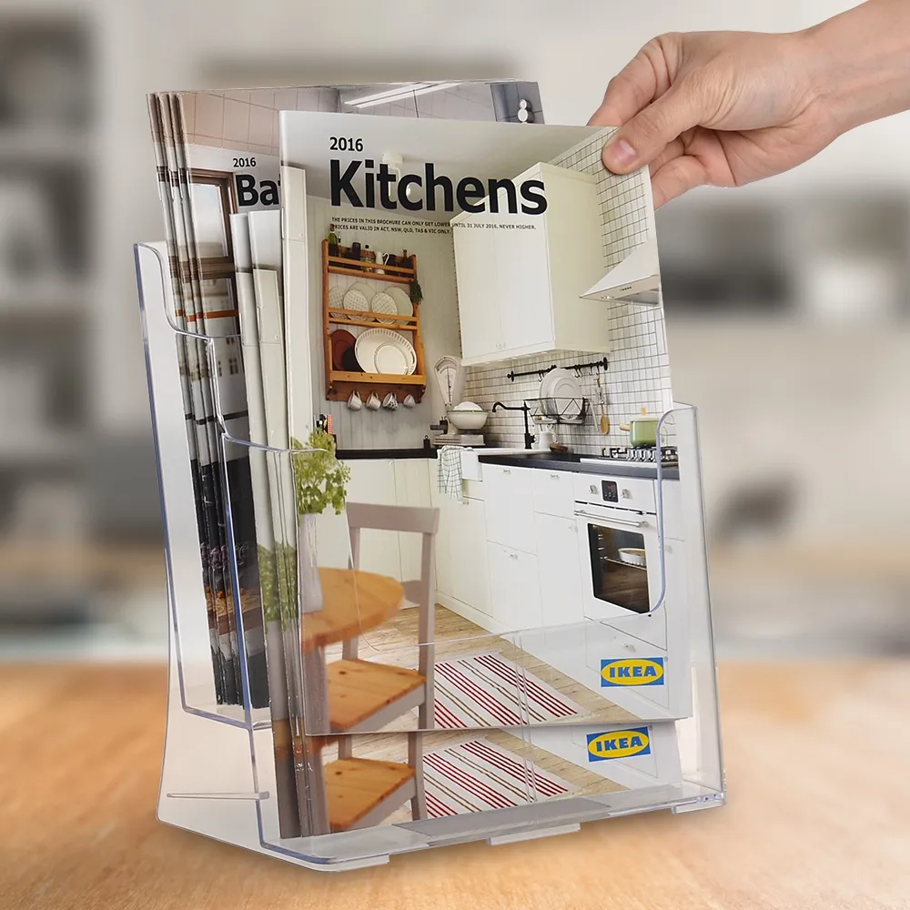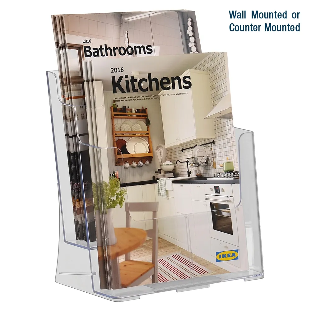 Clear magazine holders provide you with a great way to offer magazines, catalogues, brochures, and more to visitors. This display features (2) tiers, helping to save space without compromising on the amount of materials being offered. Each of the two pockets is able to display A4 (210 x 297mm) literature that is portrait orientation, with the 45mm deep pockets holding plenty of literature. There are cut-outs on each level that make removing the catalogues easy for any customer.