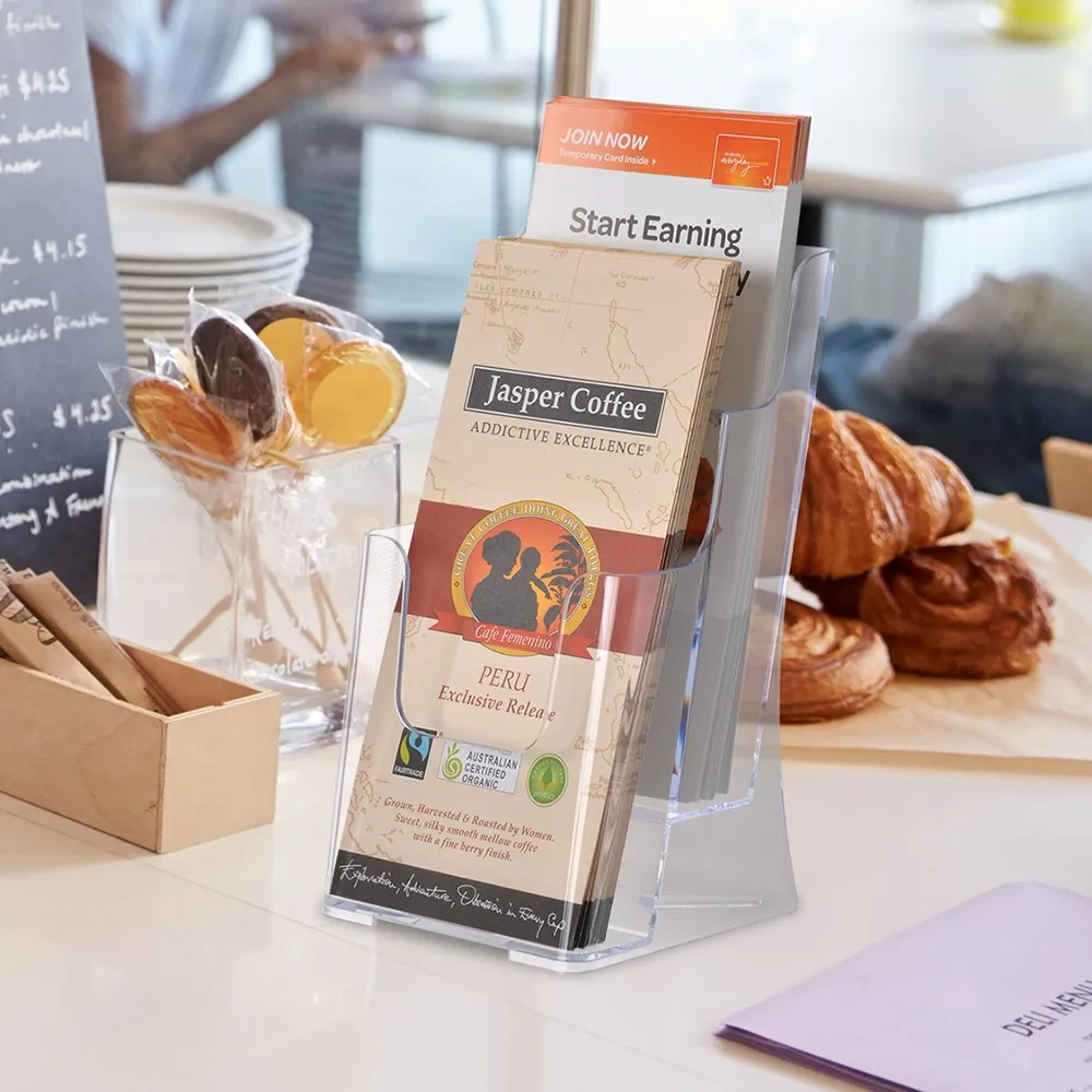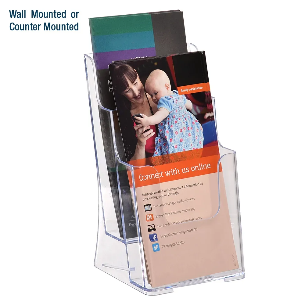 - Injection moulded plastic display offers full view of flyers in durable stand