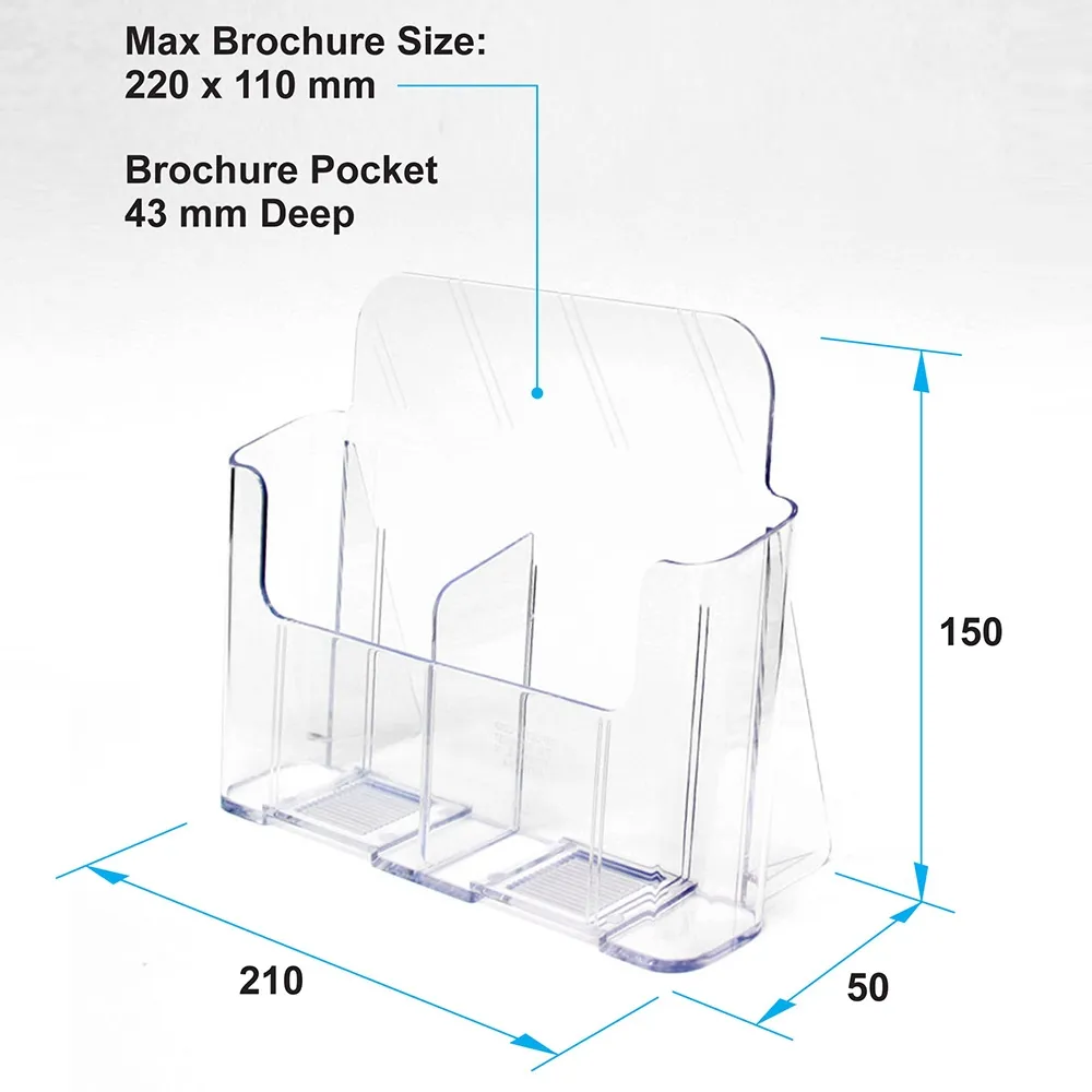 This straight forward and cheap brochure holder is injection moulded in clear plastic and can be used free standing on your counter top or fastened to a wall. It accommodates two DL brochures or pamphlets (1/3 A4 size = 210 x 99mm) side by side, separated by a moveable divider.