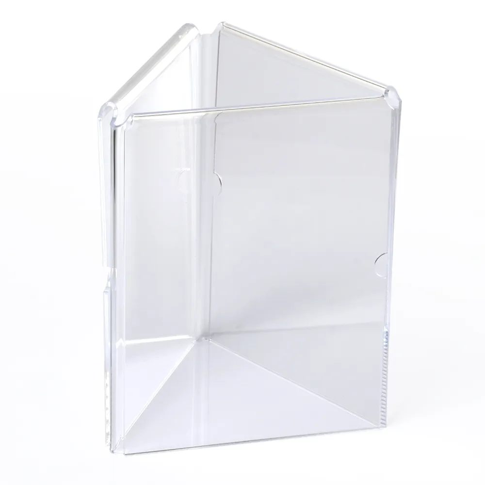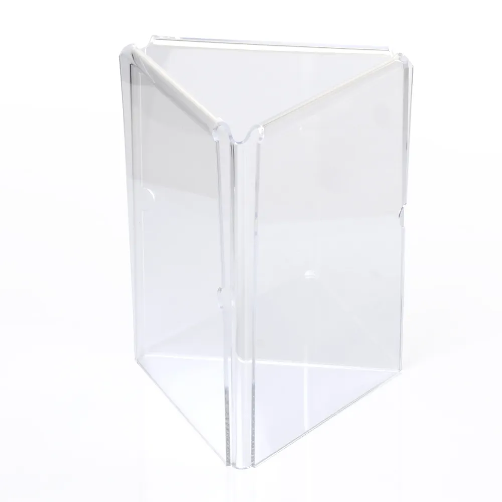 Table menu holders are now easier than ever with the A5 acrylic signs. These menu holders can simply display 3 graphics on the 3 sides and can be placed onto benches, in restaurants or café benches. With your A5 menu holder, simply slide into the side of each face where there is a slot provided, then place the table menu holder anywhere within your premise. So easy that any one of your staff can update this unit at any time. The menu holders are made of 3 mm thick clear acrylic making them very strong units for places such as eateries. They also make cleaning them very easy- a simple wipe with a damp cloth is all they need.