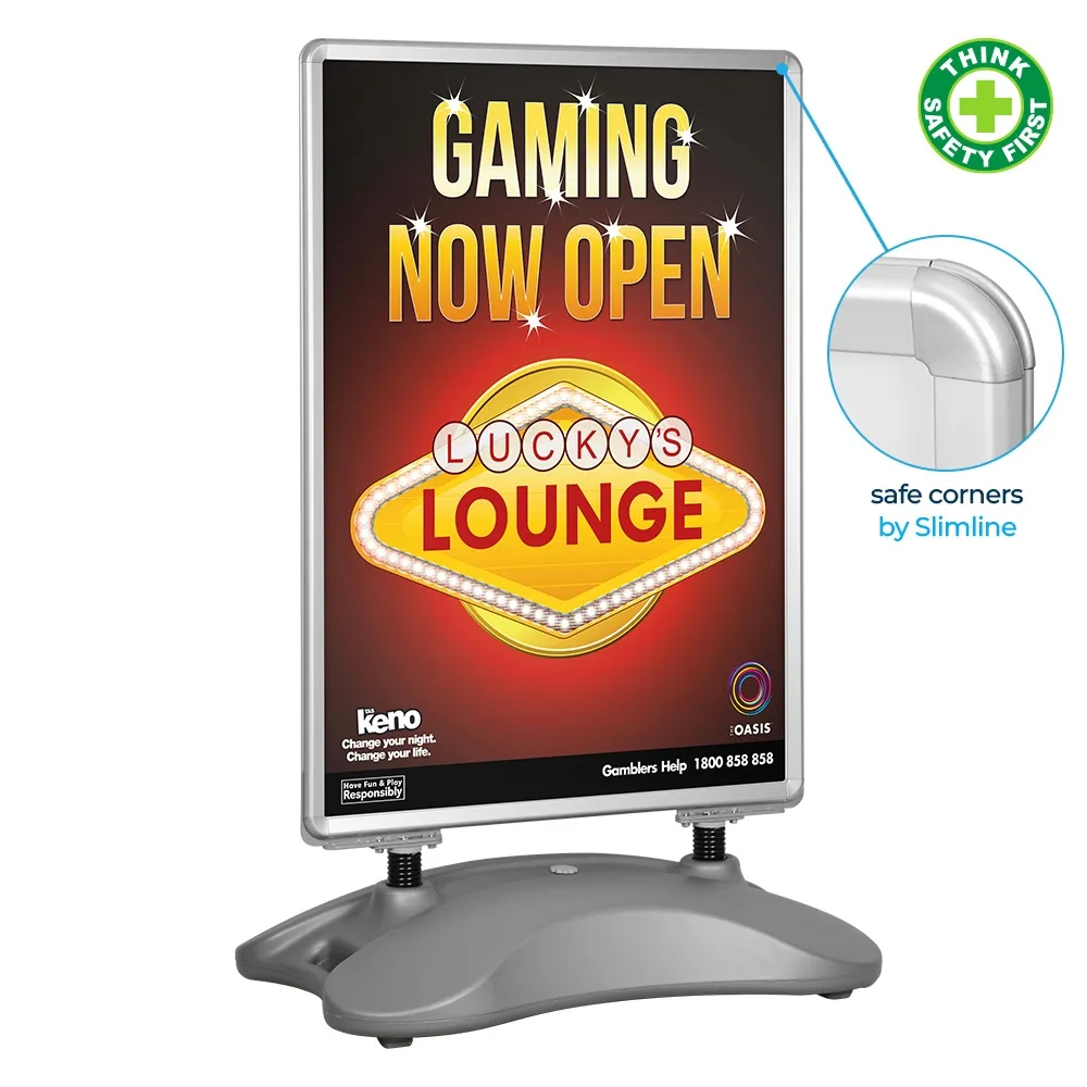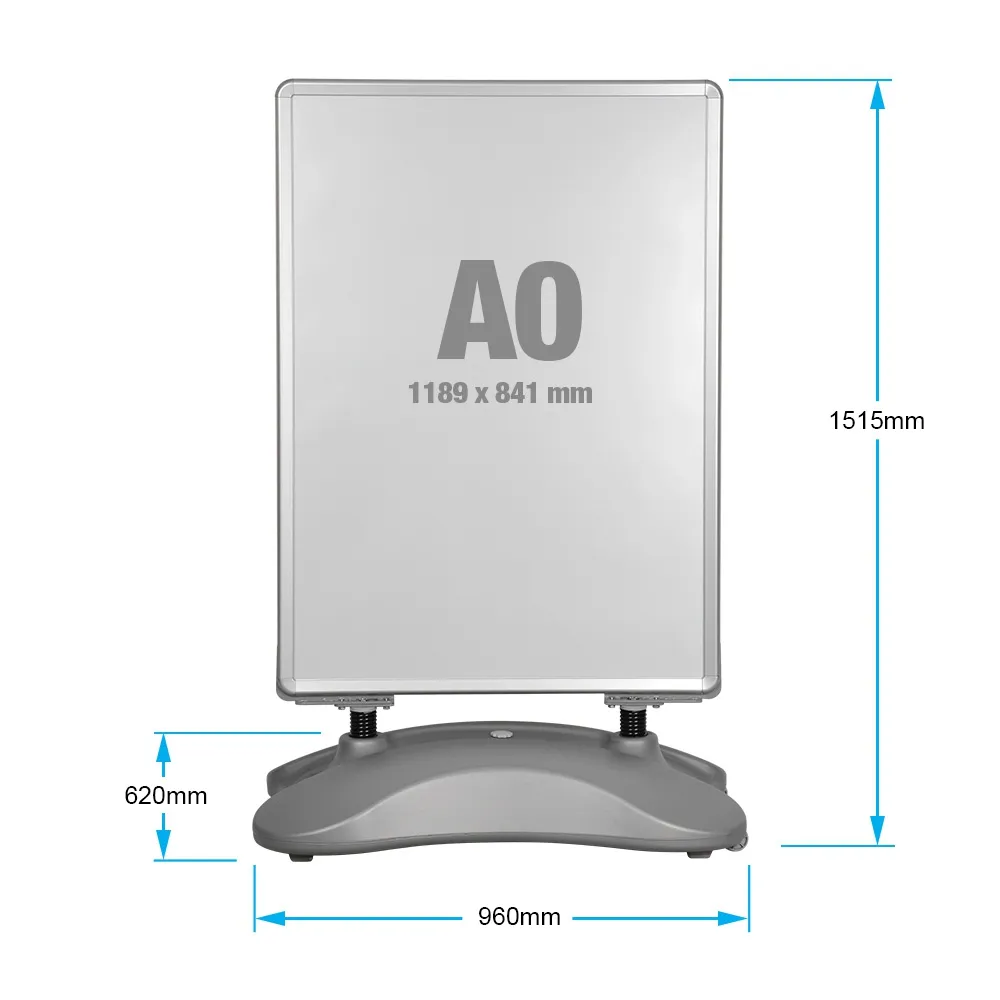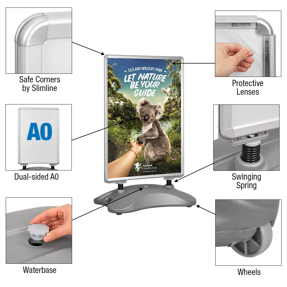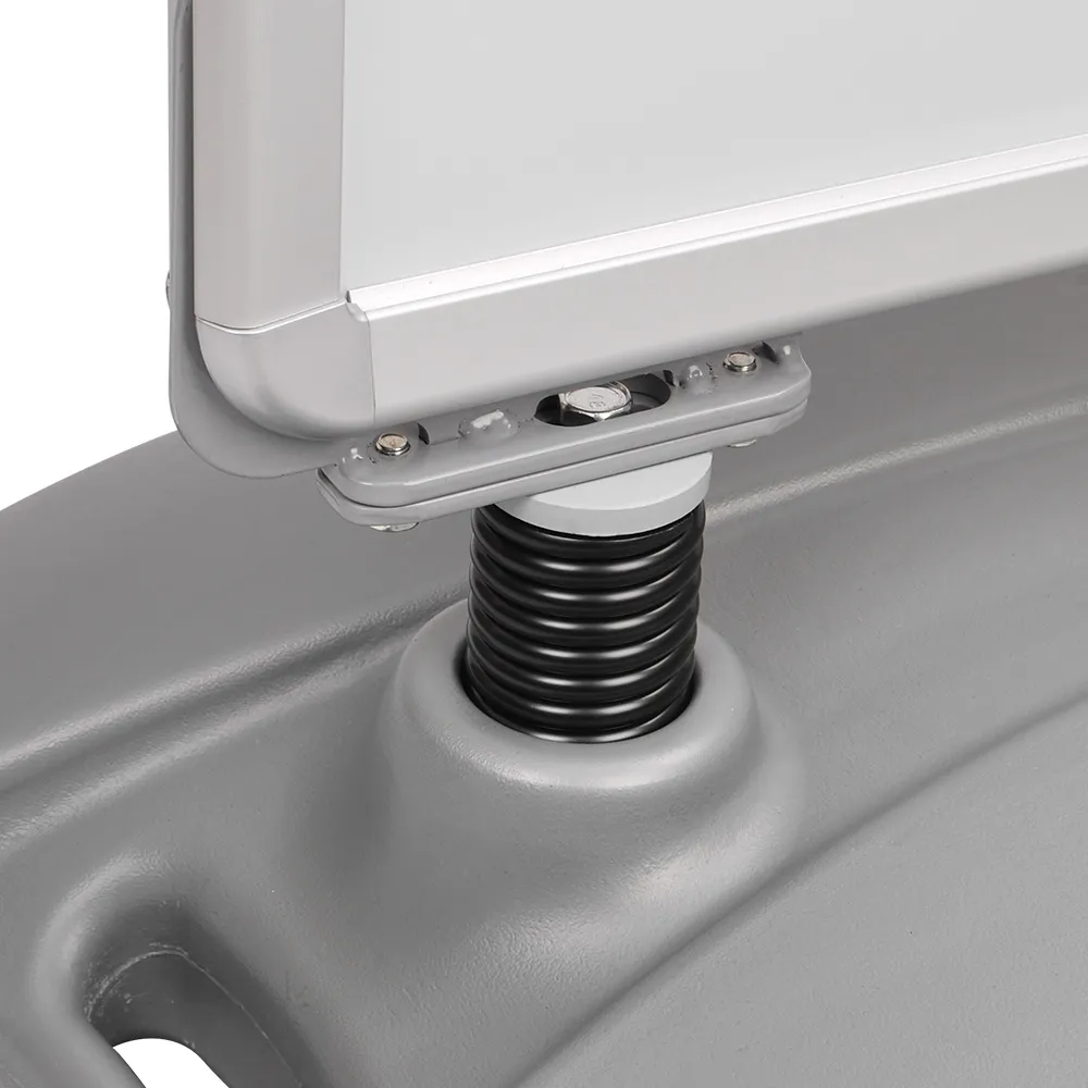 This sidewalk poster display, A board pavement sign features a fillable water base that can be used with water or sand. Filling this base up weighs it down to help provide a stable display. There are springs holding up the snap frames that allow the base to sway with winds instead of tipping over. Using snap frames on the sandwich board help make switching out graphics easy without any tools needed. A lens is provided for each side of the display that helps keep the graphics looking professional, free of grime & dust. The base of the stand also has wheels built-in, making positioning the display easy with minimal effort.