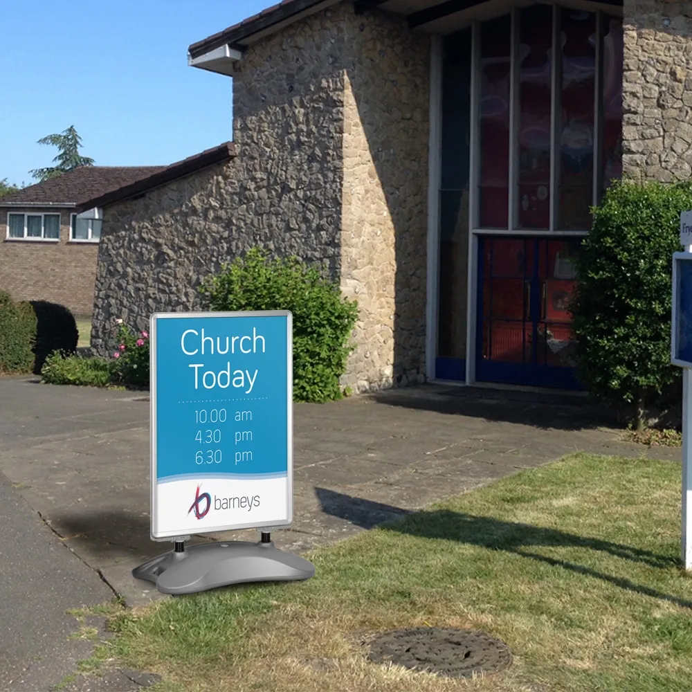 This A board pavement sign makes advertising outside of your business easy, using large A0 (841 x 1189mm) graphics to help draw the attention of potential customers. The outdoor sandwich boards are dual-sided, able to maximise space outside of your business by advertising in two directions at once. This type of display has been purchased by retail stores, restaurants, travel agencies, museums, information centres, universities, news agents, and nearly every other type of business!
