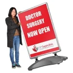 - A board pavement sign uses fillable water base to provide stable display even in winds