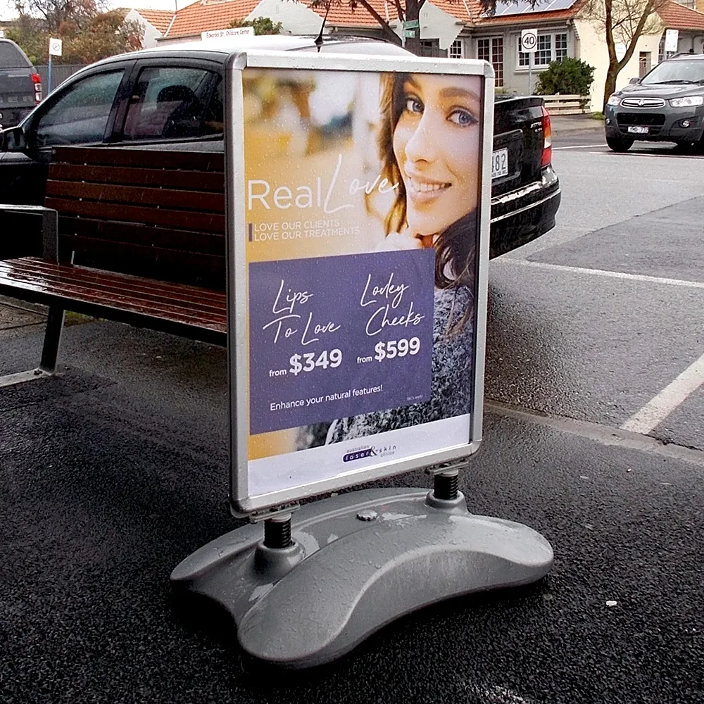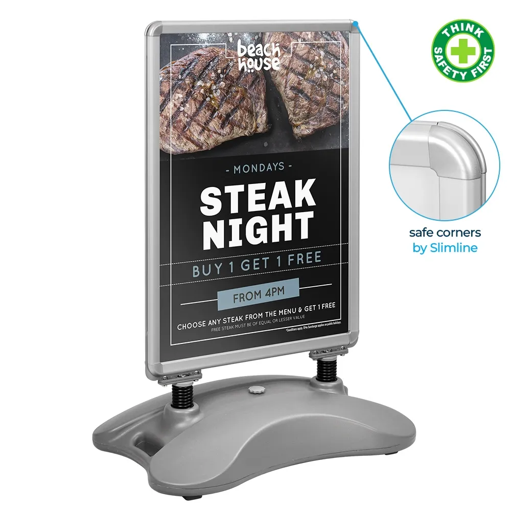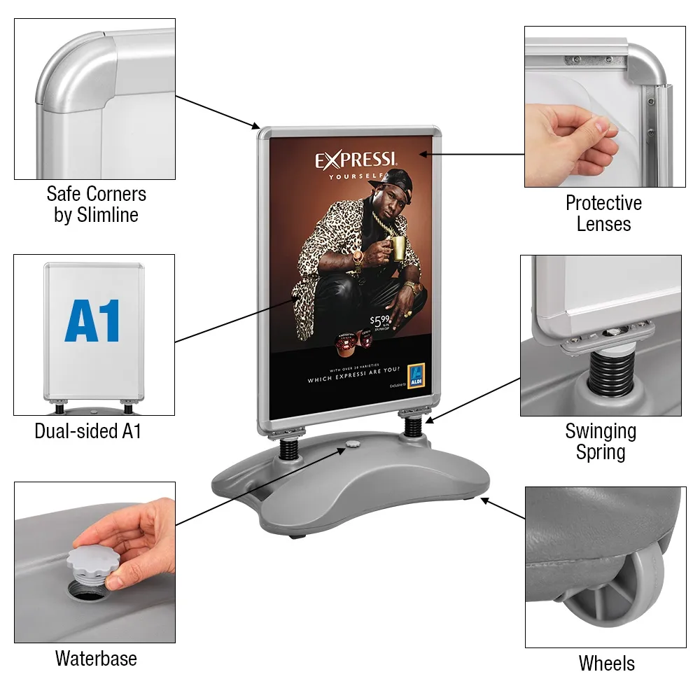 This pavement signage is designed to hold (2) x A1 (841 x 594mm) graphics that are in portrait orientation. These graphics are held in place with a snap frame, making it easy change out posters with no tools required. Simply snap open the (4) sides, remove the lens and replace the graphic with the lens, and snap it back shut! Lenses are included as well which help to protect the display graphics without hindering readability, helping to keep posters clean and professional looking during use. These lenses also help to improve readability of graphics as well.