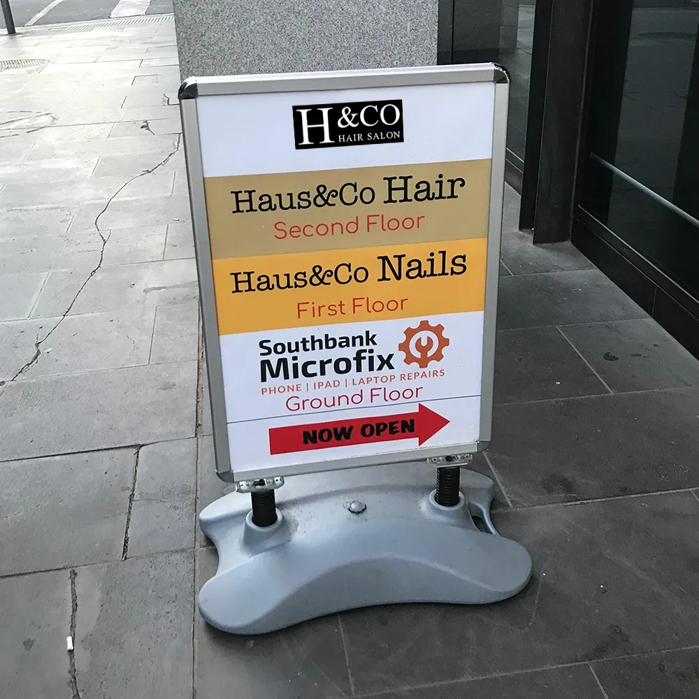 This pavement signage, also known as sidewalk signs and outdoor sign displays, are a common way to advertise and promote outside of many different businesses effectively. The dual-sided display is able to reach out to more customers at once without taking up additional floor space, allowing you to maximise the number of people that read your adverts without taking up space!