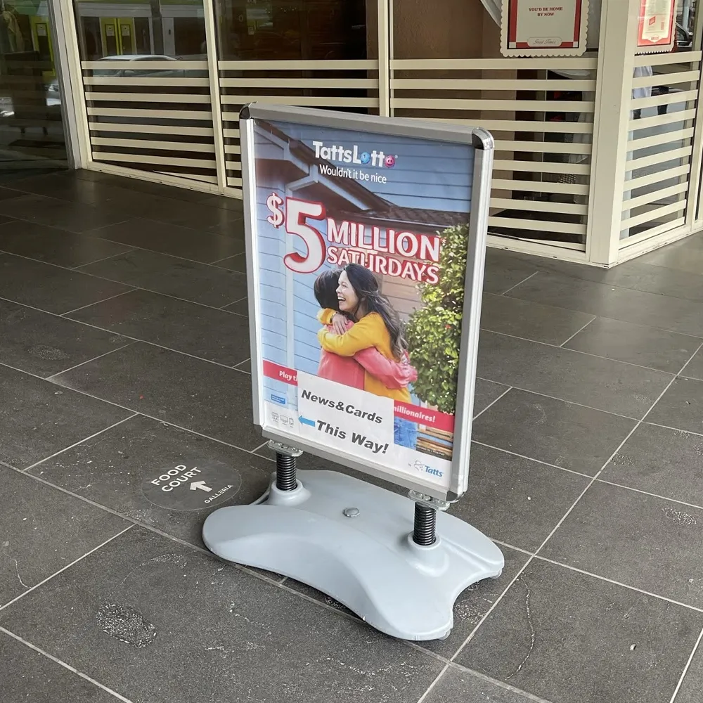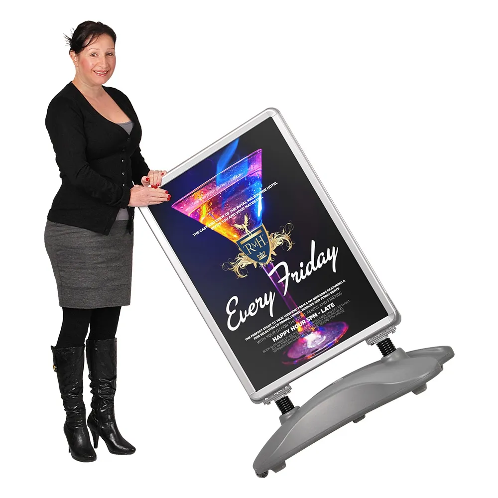 The A frame sign features a fillable base that allows the stand to be placed outdoors in winds with little worry of it knocking over. By filling the base with sand or water, you increase the weight so that the stand will sway instead of blowing down. If it's not necessary if your area, there is no need to fill the base and it's still heavy enough to work in standard conditions. The two posts for holding the signs also features springs that, unlike a rigid sign, allows signage to sway with the wind easily, which makes it best for use outdoors!