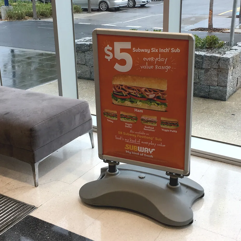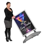 Please note that while the snap frames and lens work to seal out moisture, some water can still seep into the frame during inclement weather, and possibly damage your posters. We recommend either laminating your signs or bringing the sandwich board indoors during wet weather conditions. For a 100% Weatherproof Sidewalk Sign, we recommend our 100% Waterproof Outdoor Patented Premium Model.