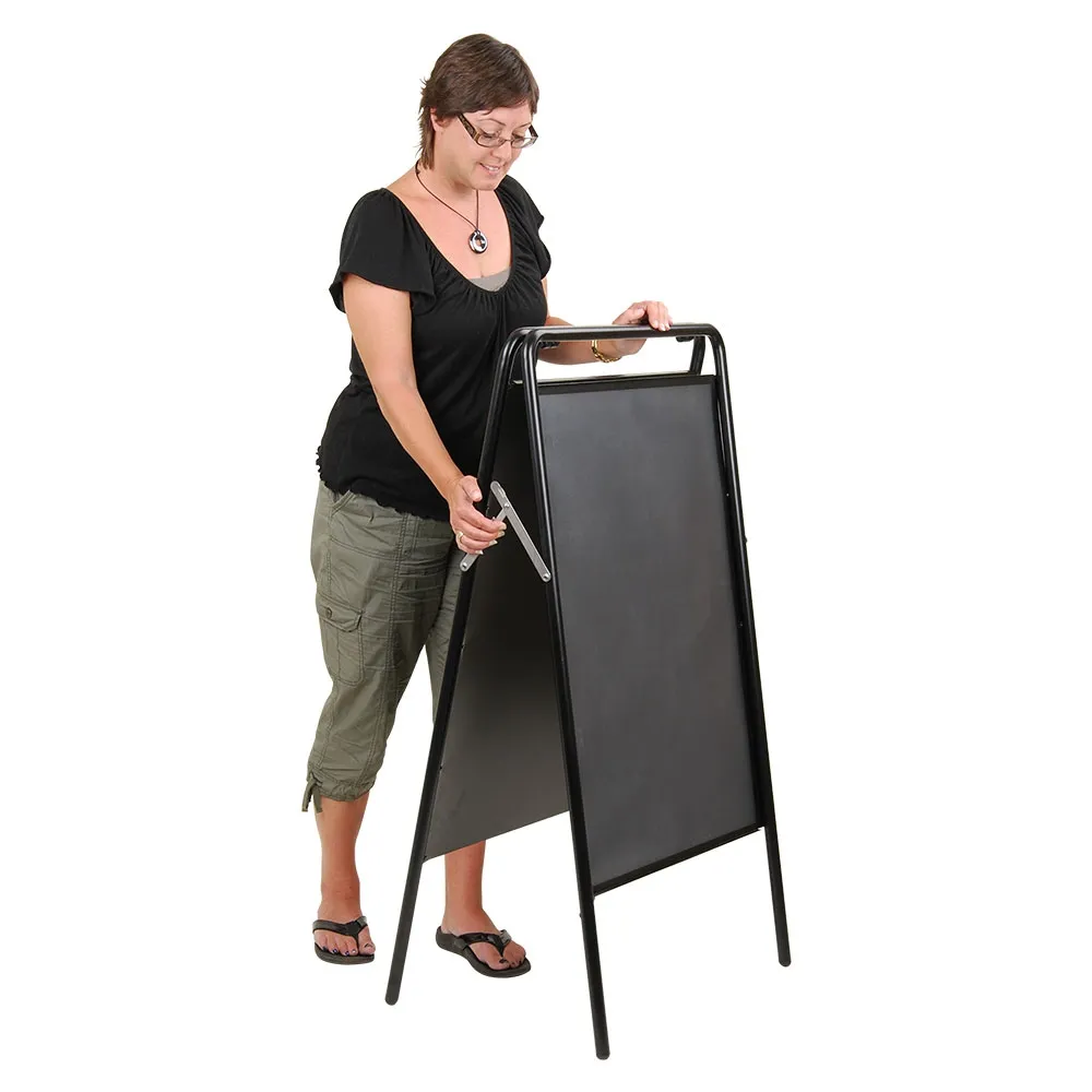 These metal a frames are a dual-sided display that makes it easy to reach out to more customers at once without taking up a large footprint. The outdoor sidewalk signs are weatherproof to be used outside in most conditions without worry. The portable displays can easily be moved into position as well, with the folding design making it easy to put them so that passersby can read your advertisements and learn about upcoming sales or ongoing events!