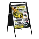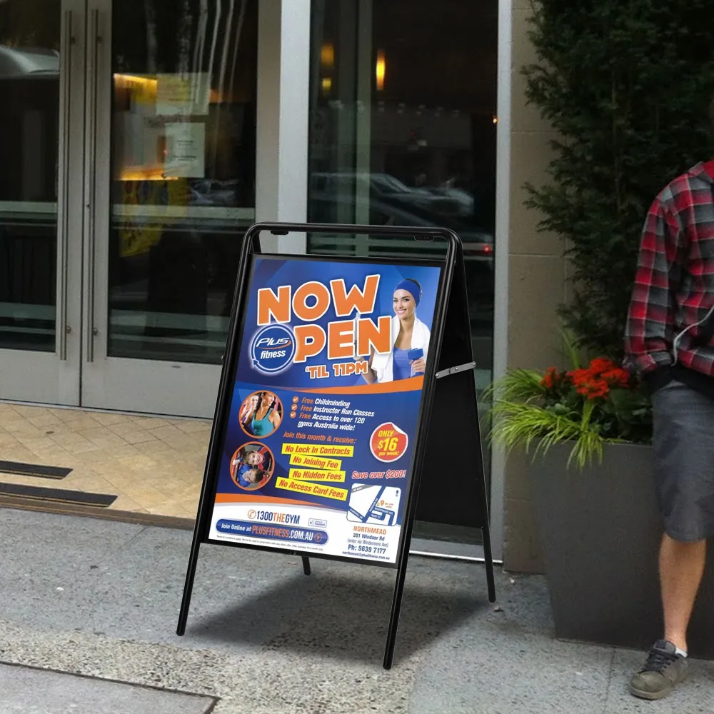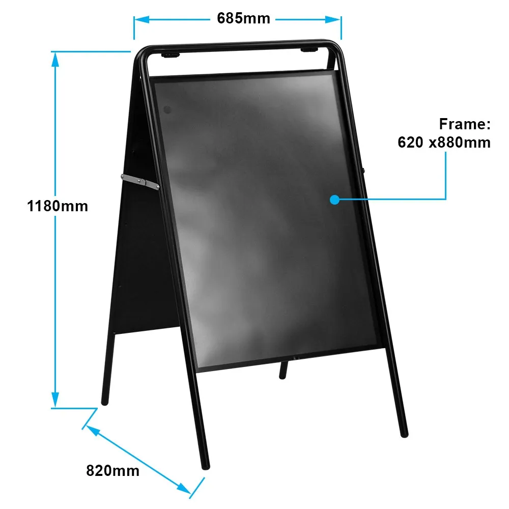 These metal a frames, also known as pavement sign displays, are designed to hold an A1 (594 x 841mm) custom graphic on each side of the display. This large size is easily seen whether placed outside of shopping centres, retail stores, cafes, restaurants, transit stations, or exhibition halls. There are lenses included as well that help protect custom posters from the elements as well as helping to prevent vandalism. The iron make offers a durable stand that works well for years to come in any location. The black powder coat finish fits in perfect with any décor!