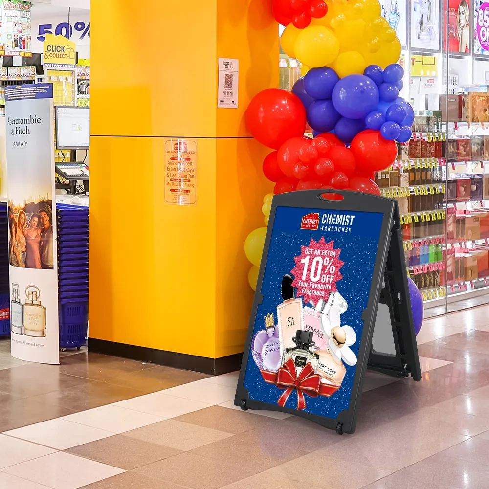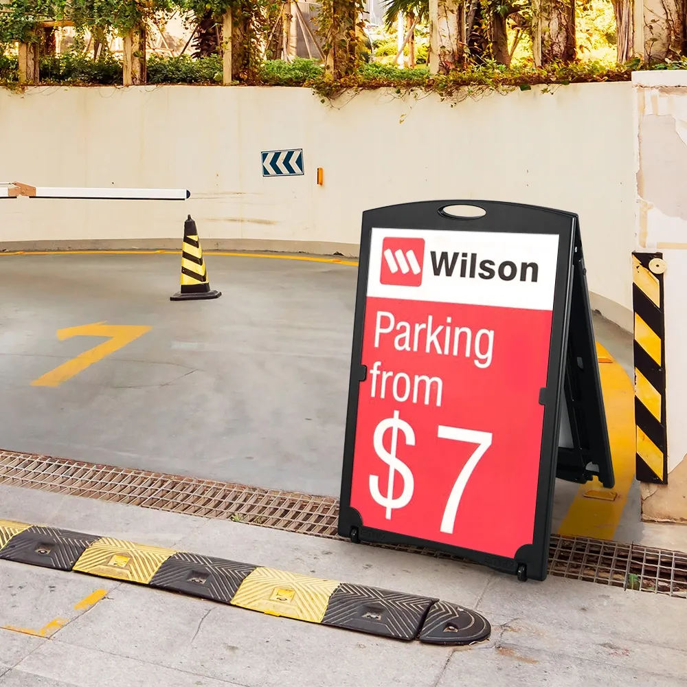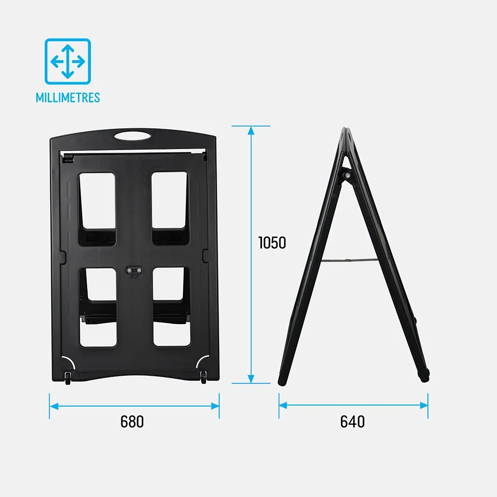 The printed A frame signs, like pavement displays, feature graphics on both sides to maximise space without impeding footpaths. The unit is designed for indoor use, but is rust-proof and has a UV coating to allow for outdoor use in good weather conditions. This portable display has a built-in handle to make carrying the 6.9kg unit easy. There is a wheel kit included as well to have (2) casters affixed to the bottom of one side to allow the display to be wheeled into place with ease.
