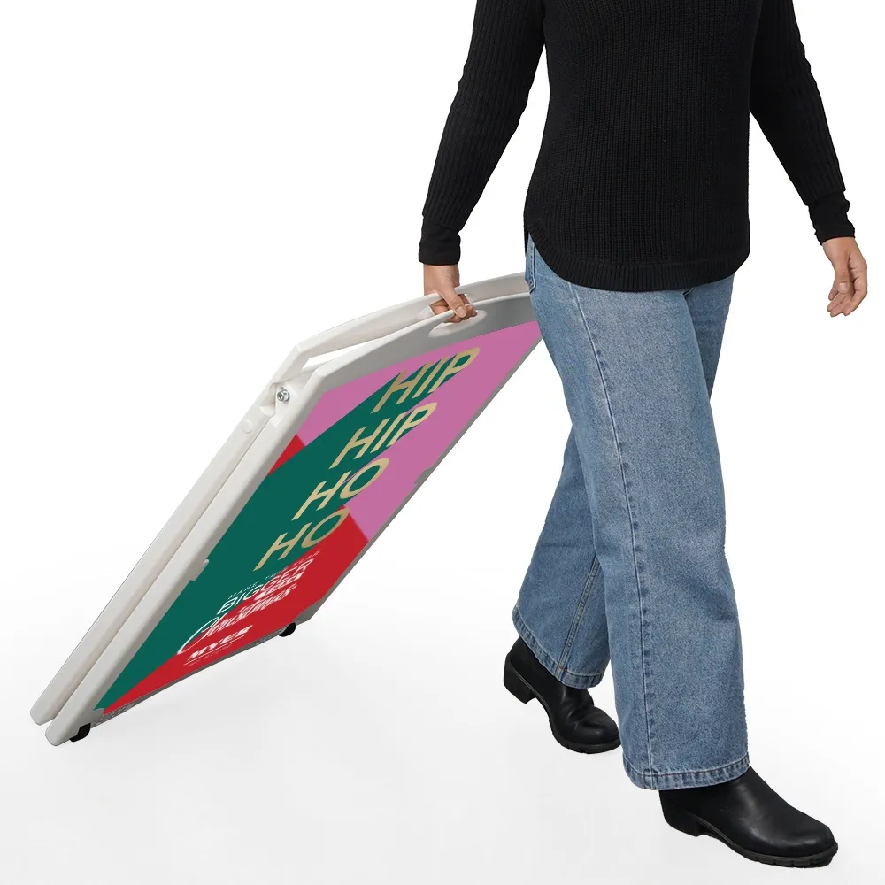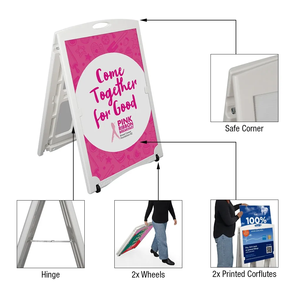 Custom sandwich board signs, like many portable A-frames, have a built-in handle to make carrying the display into position simple. This unit has a wheel kit included, with the (2) casters able to be affixed to one side of the base to allow the 6.9kg unit to be easily rolled into desired place. This unit folds flat to 75mm thick, making it easy to store in a small space or bring it to different events. This unit is designed for indoor use, but is built from rust-proof materials for use outdoors in good weather conditions. A UV coating on the frame ensures longer lasting use as well.