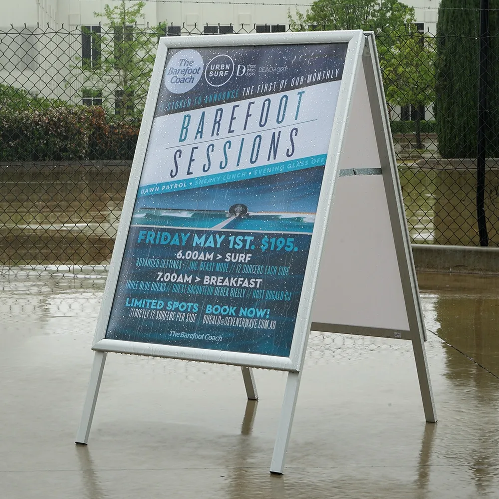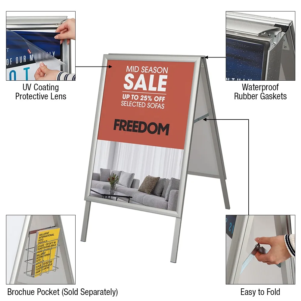 These outdoor pavement signs, A frame advertising boards have a patented waterproof design to allow use in different weather conditions without worry. Rubber gaskets line the inside of the frame to prevent water seepage when the protective lens is place. The clear PET lens also has a UV coating to protect against sunlight and help keep graphics from fading over time. The collapsible design of the sandwich board makes it easy to carry the 6kg unit to desired place and store in small space when not in use. Metal hinges ensure the sides remain open whilst in use.