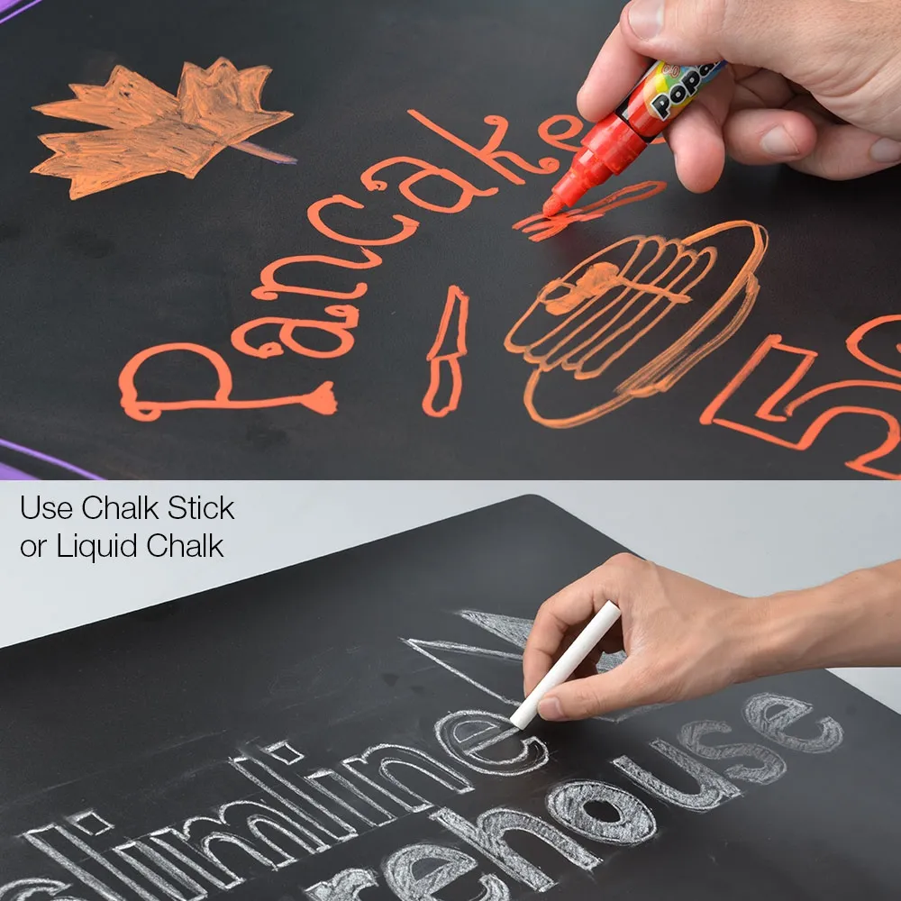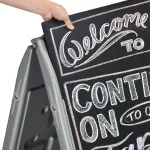 This A frame chalkboard helps pubs, museums, retail stores, cafes, shopping centres, news agents, and more reach out to passersby to help turn them into customers. The write-on sandwich boards have 600 x 900mm textured blackboards on each side of the display, able to be written on with chalk sticks and liquid chalk markers in any colour. Use a damp rag to wipe away the writings cleanly and start over with a fresh surface.