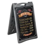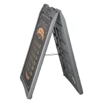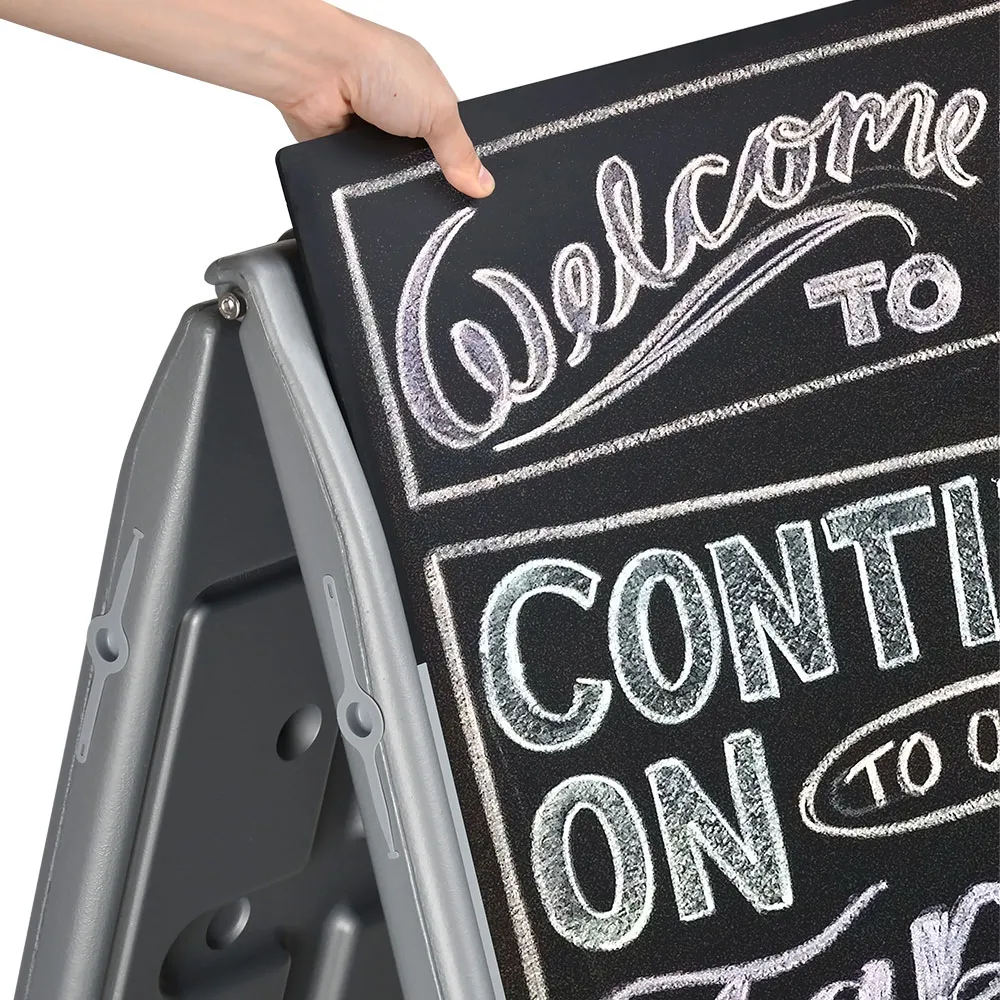 This A frame chalkboard, one of many sidewalk signs currently on offer, is a dual-sided display to maximise space by being able to be seen in multiple directions at once. Each of the included black boards is dual-sided as well, so you can have different advertising written on each side and then flip them over at the appropriate time to convey the right message to potential customers. The slide-in design of the holder makes switching them out fast and easy, and they rest securely within built-in channels.
