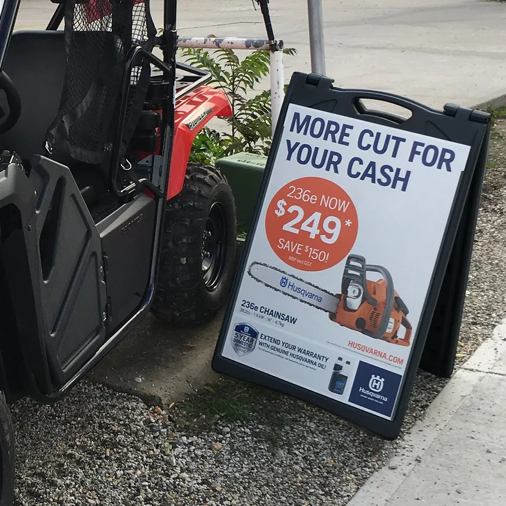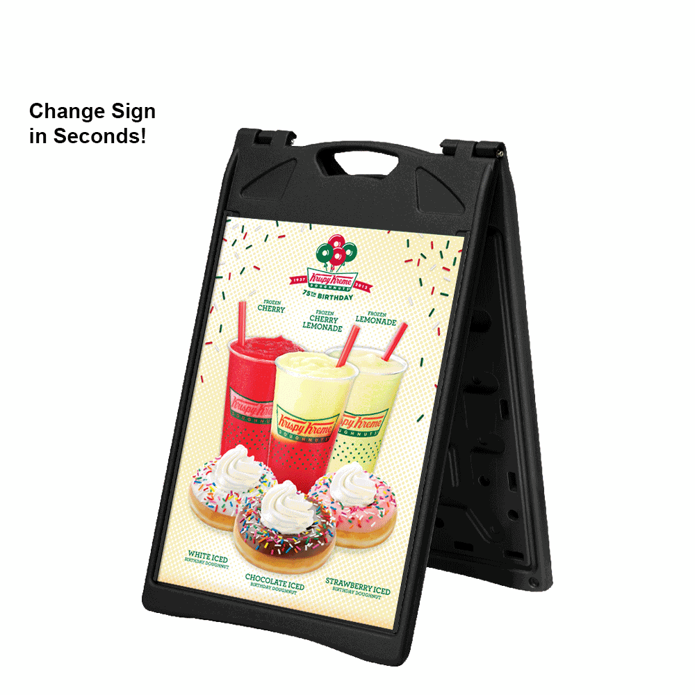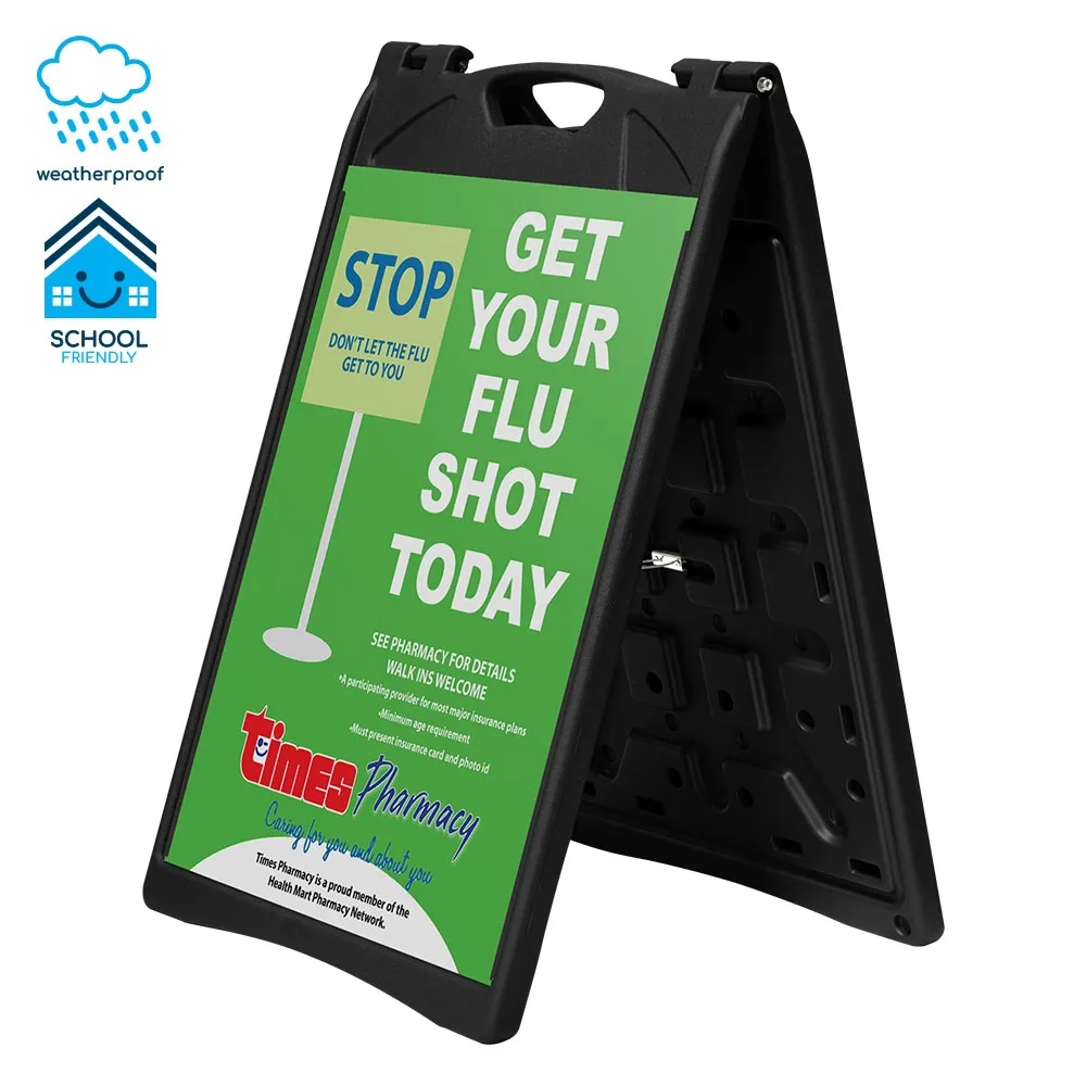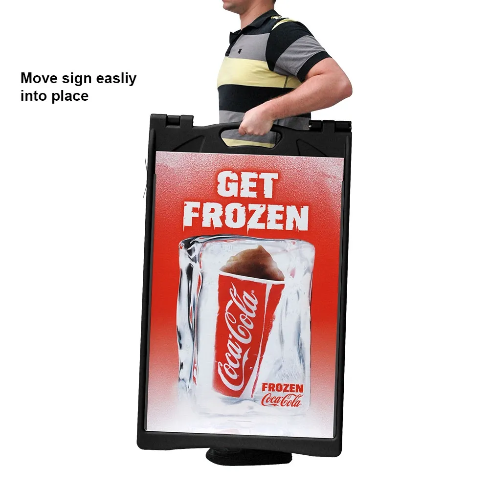 The sidewalk stand, A-sign board is an indoor and outdoor display with safety rounded corners. Unlike some metal frames, these signs are made from roto moulded polyethylene, so they will not rust or dent, making them ideal for heavily trafficked areas in any environment. The black A-sign board has a fillable base for putting water or sand to keep the stand stable, even in windy conditions. The A-sign board has a built in handle, making moving the display around your business easy. These signs make A-boards cheap and can also have other graphics printed on any substrate up to 5mm thick, making this affordable display reusable over time!