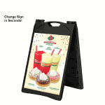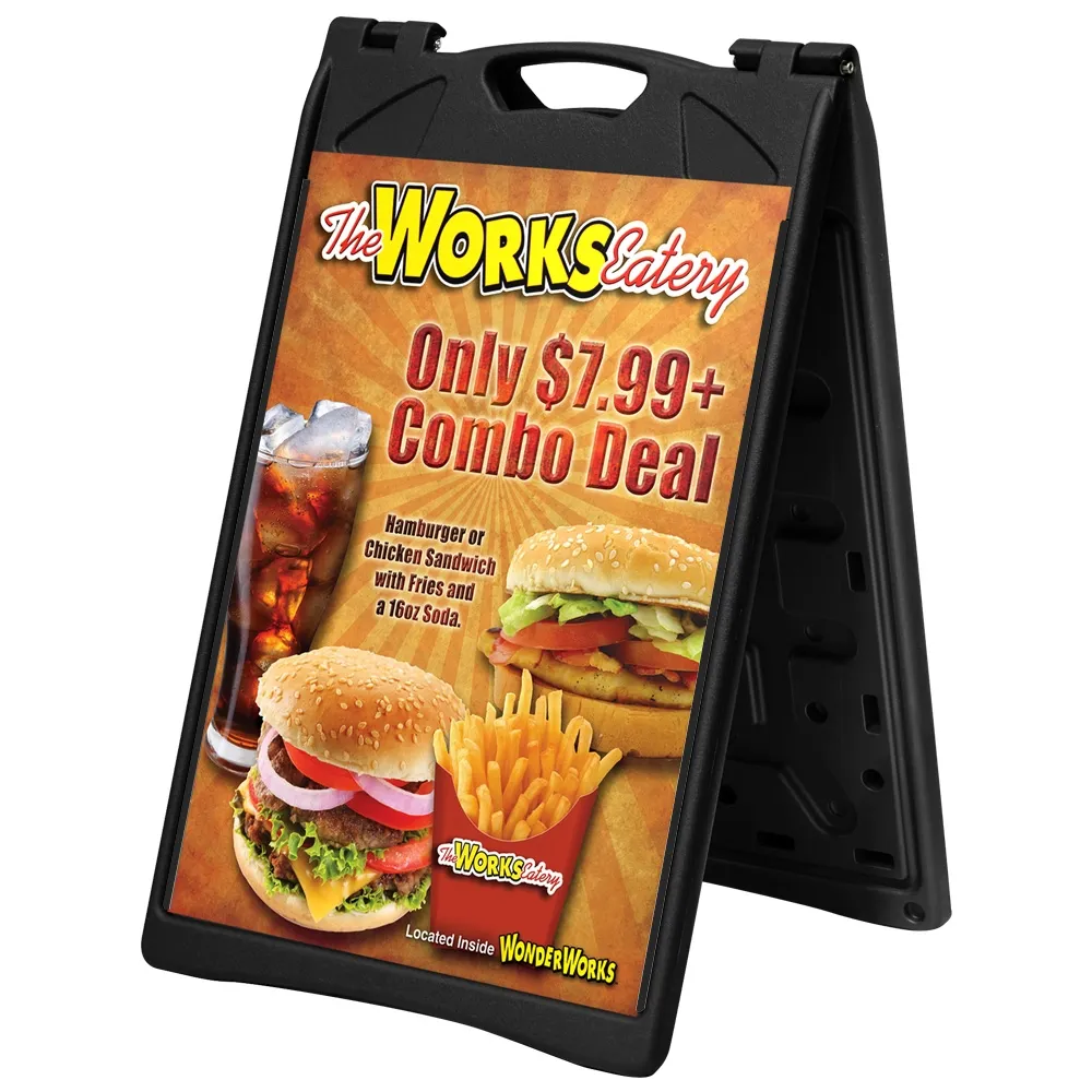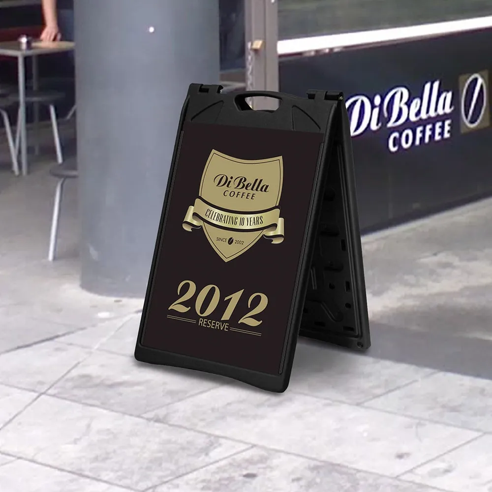The A-sign board is used in many different locations, including restaurants, bars, shops, and realtors to promote menu specials, upcoming sales, and other information. These A frames Melbourne are constructed of roto moulded polyethylene, providing a strong yet lightweight display that will last many years. The A-sign board, like A boards cheap, include (2) printed Corflute panels that feature your custom designs. The pavement display requires no tools for placing the graphics onto the stand, as they slide easily into aluminium channels. This low cost A-sign board can be used as a single or double sided display, providing customers with different options to promote their company with!