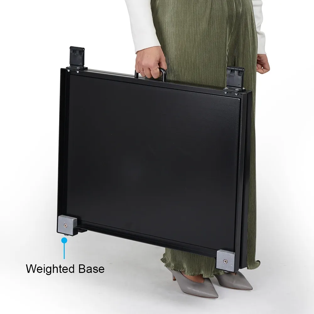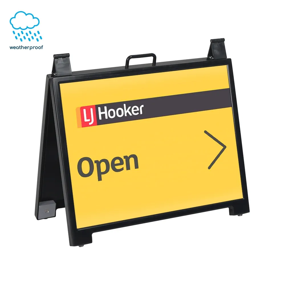 The A frame printed signs, like real estate sign boards, are 630 x 580 x 415mm when fully open to provide a visible display without taking up heaps of space. The entire unit folds down to only 50mm wide to make storage and transportation easy. A built-in handle on top of the pavement sign makes carrying the 4kg unit into positions simple. There are rubber feet on the bottom of each foot that prevent damage to surfaces when used in doors whilst helping keep the sandwich board from sliding out of place. Weights above each foot on the interior of the sign provide additional stability.
