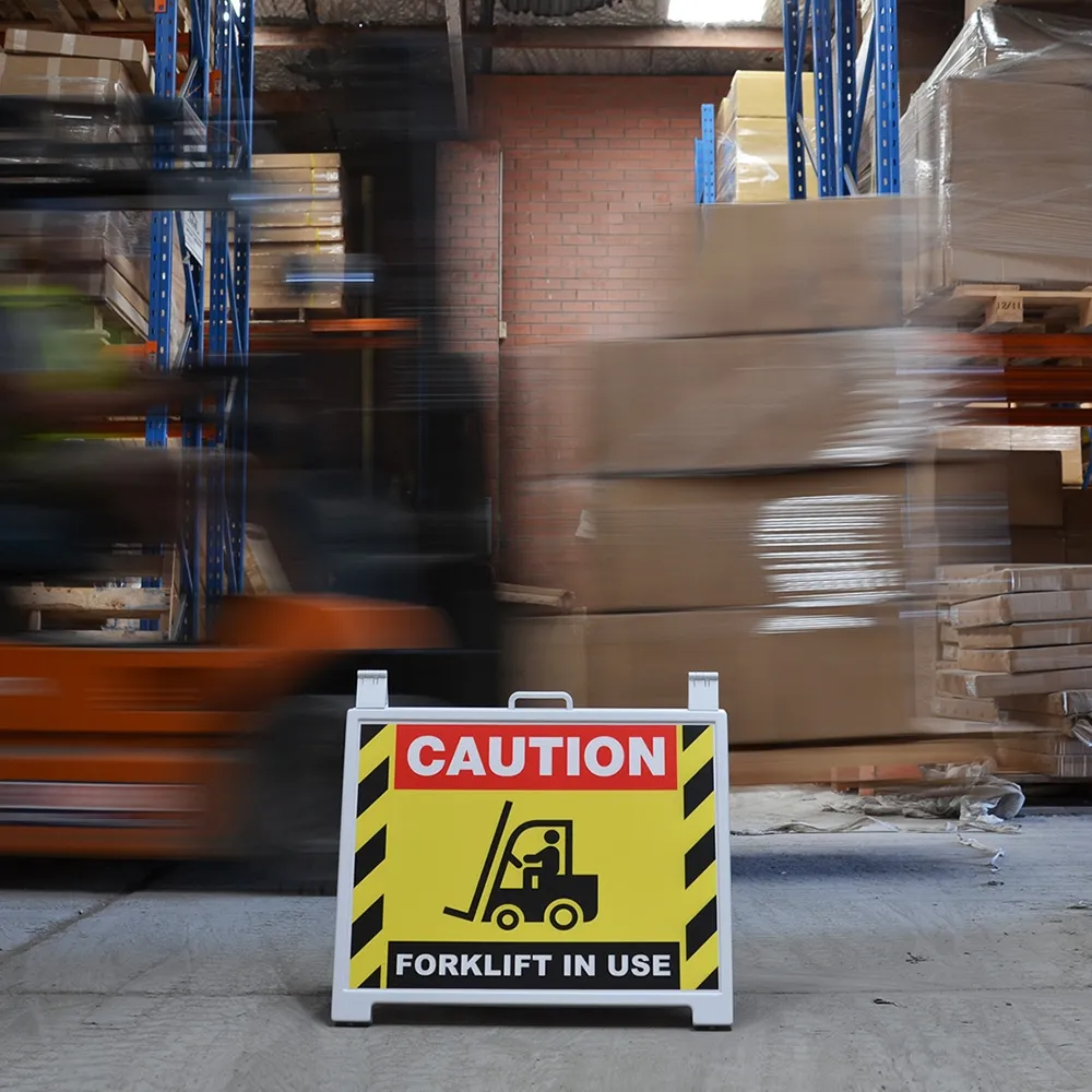 This forklift in use sign features a lightweight a frame sign to create a totally portable display for use in many locations! The safety sign is has a handle on top to make transporting and moving the display into position easy. The lightweight sign is great for job sites, loading areas, restricted zones, warehouses, and more to given notice to passersby to be cautious. The compact design ensures storage in between uses leaves heaps of space for other items.